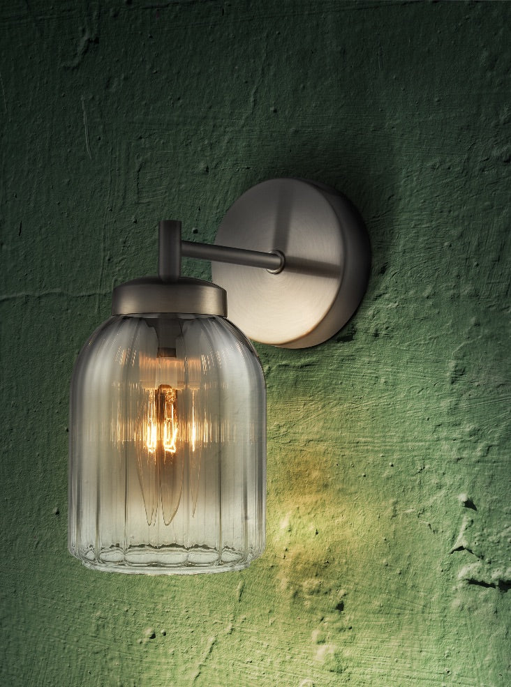 A satin nickel finish wall light with ribbed glass featuring a smoked ombre effect.