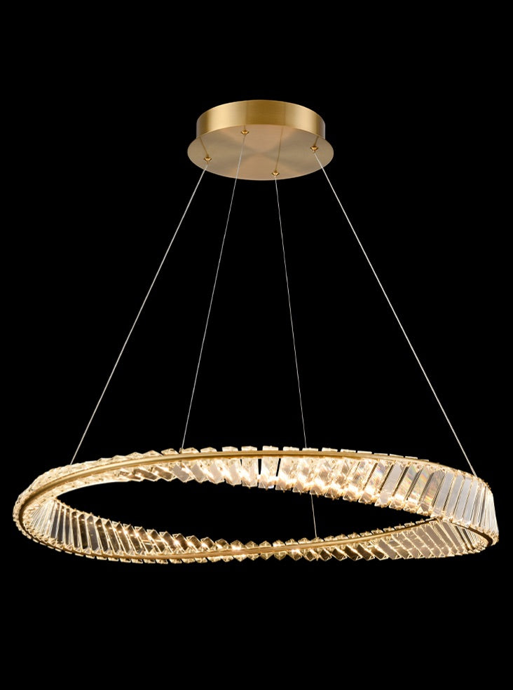 Aged brass finish LED pendant featuring twisted metalwork adorned with rectangular crystals. The pendant is dimmable with a trailing edge dimmer.