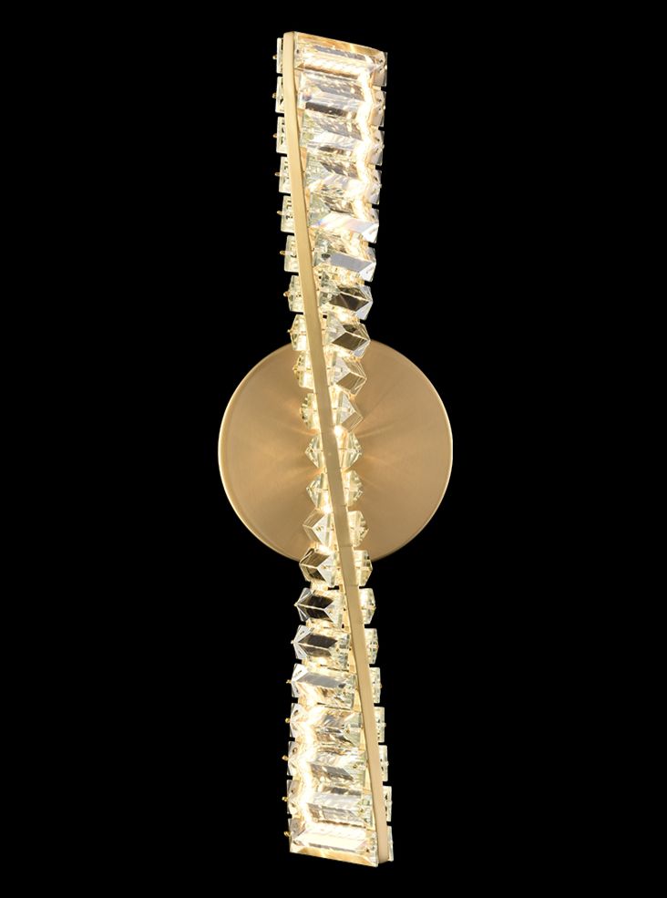 Aged brass finish LED wall light featuring twisted metalwork adorned with rectangular crystals. The wall light is dimmable with a trailing edge dimmer.