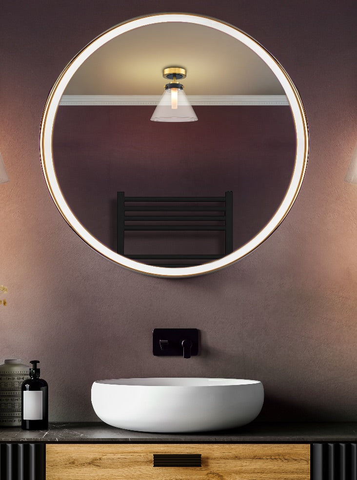 Matt black and aged brass finish semi flush fitting with clear conical shaped glass. Suitable for use in every bathroom zone except zone 0. Rated IP44.