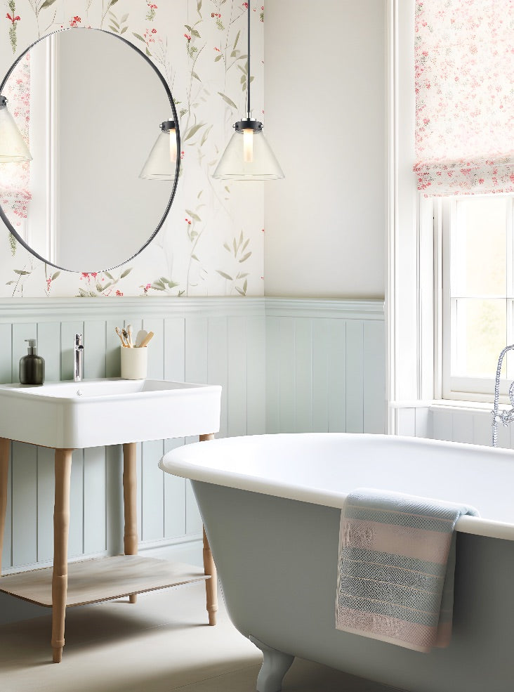 Matt black and polished nickel finish pendant with clear conical shaped glass. Suitable for use in every bathroom zone except zone 0. Rated IP44.