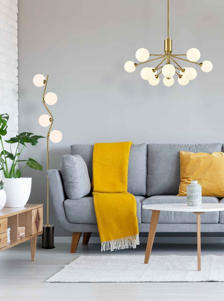Antique gold finish 4-light floor lamp with opal glass spheres and black base. There is an in-line switch on the cable.
