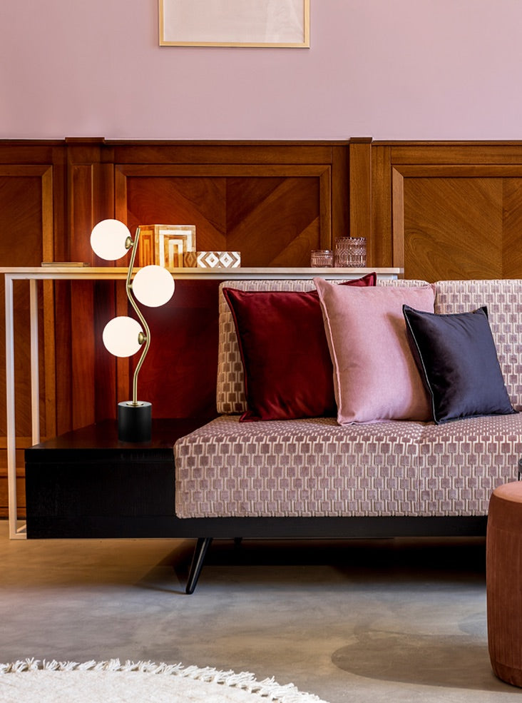 Antique gold finish 3-light table lamp with opal glass spheres and black base. There is an in-line switch on the cable.