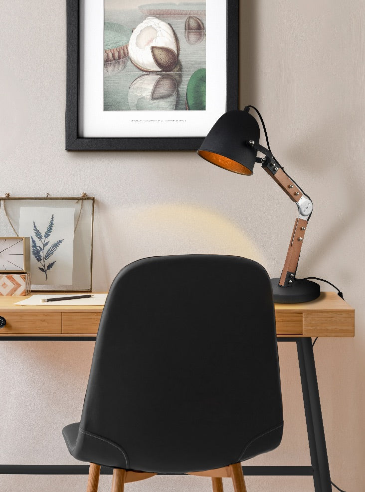 En stem and black metal base and head. The inside of the head is a rich gold finish which enhances the colour of the illumination. There is a switch on the cable.