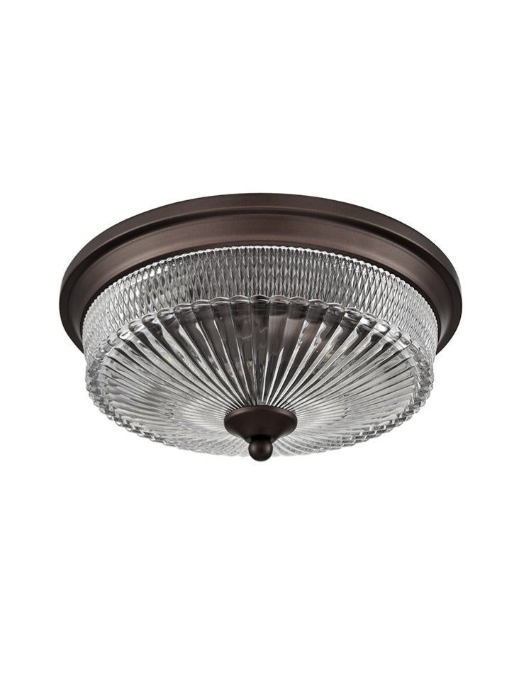 A dark brown finish flush ceiling fitting with decorative clear ribbed glass.