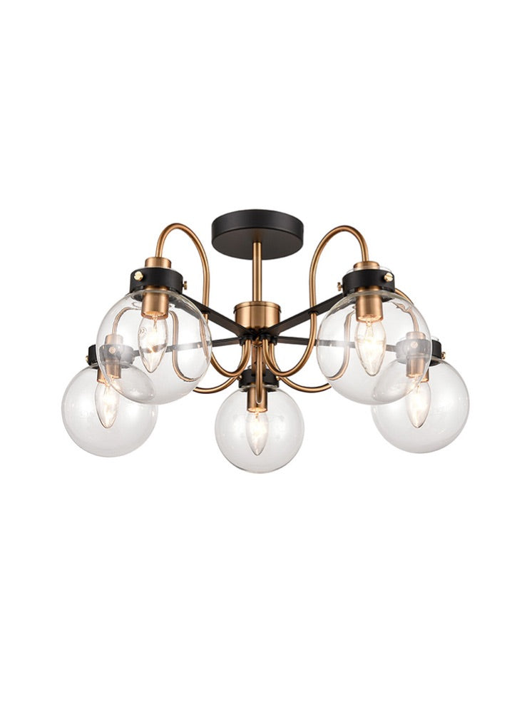 An 5-light semi-flush fitting, finished in antique gold and matt black with clear glass spheres. This fitting is suitable for low ceilings.