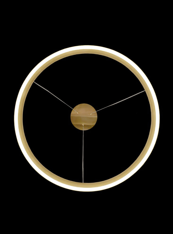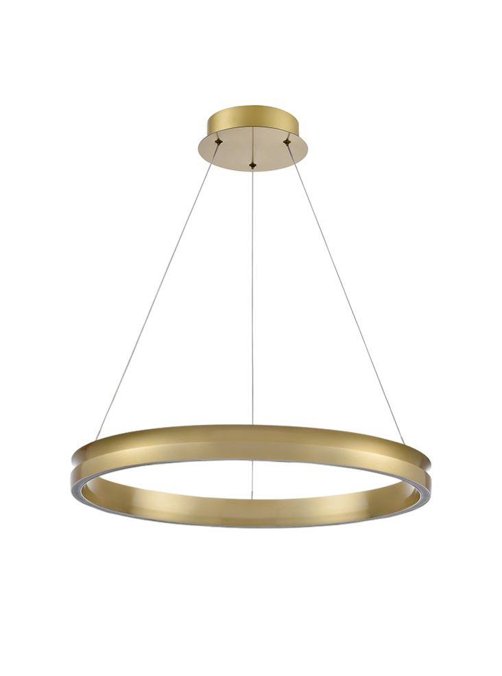 Small satin brass single tier circular LED pendant. Adjustable prior to installation and dimmable with a trailing edge dimmer.