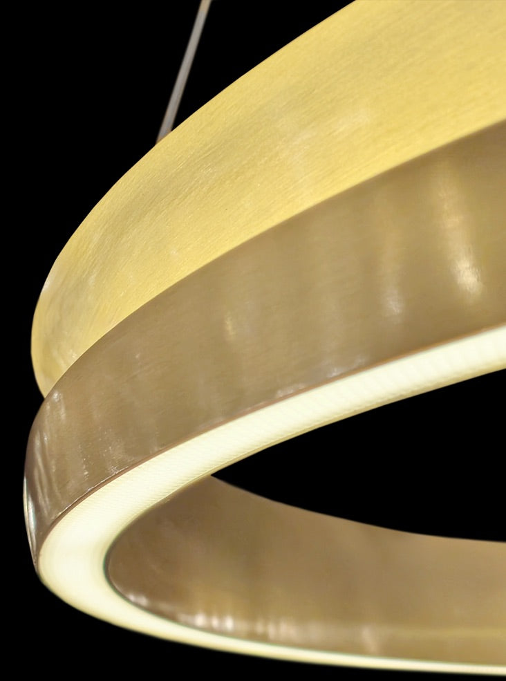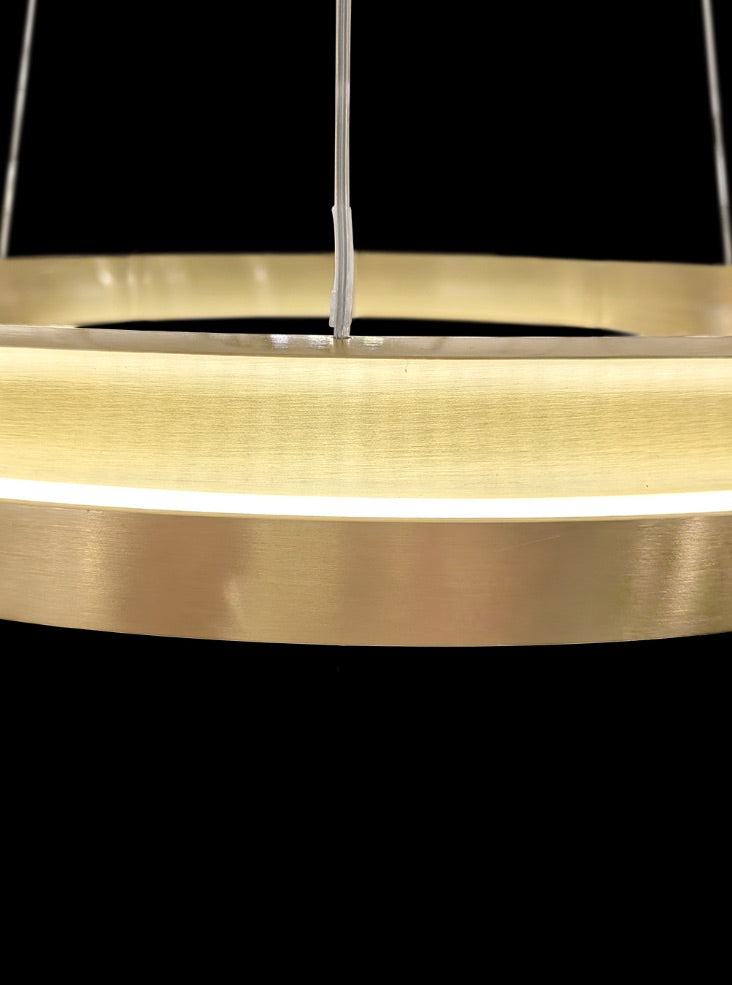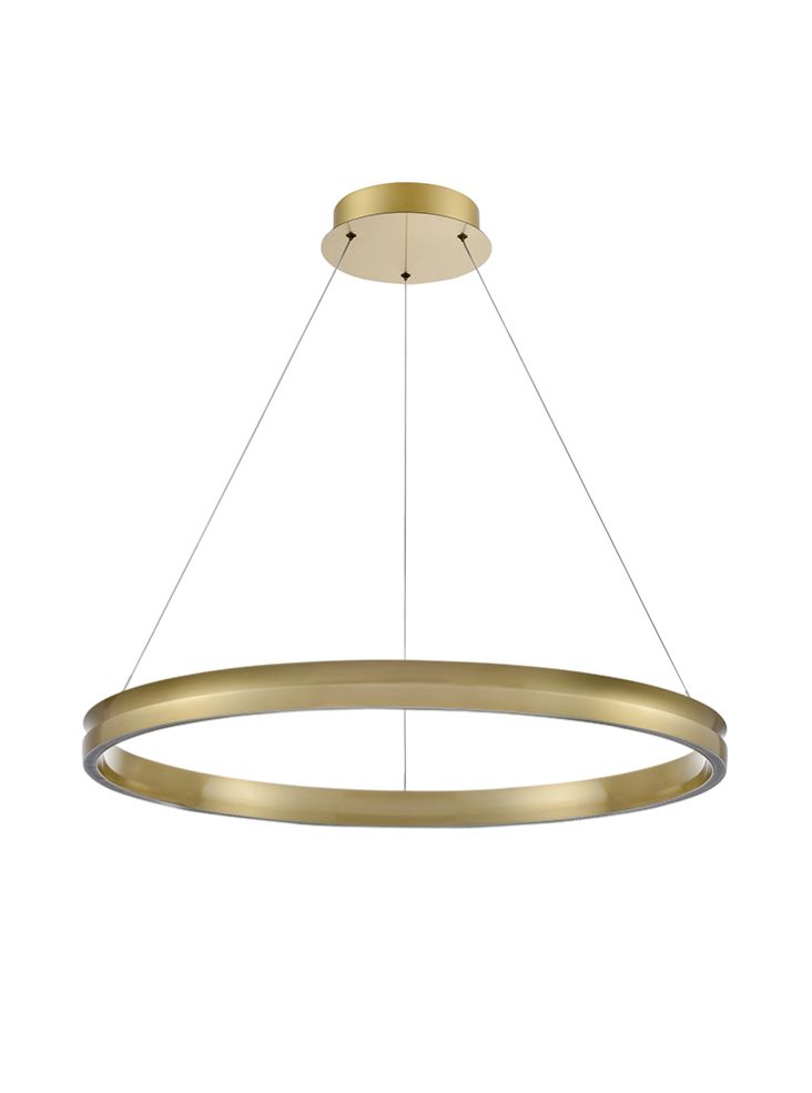 Large satin brass single tier circular LED pendant. Adjustable prior to installation and dimmable with a trailing edge dimmer.