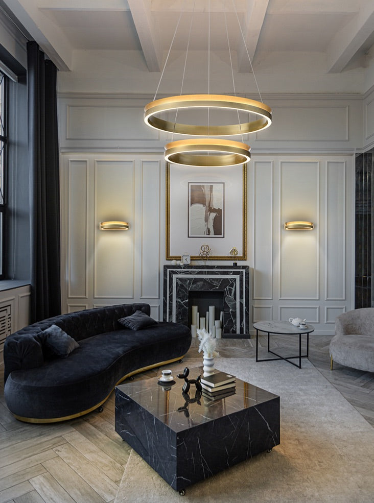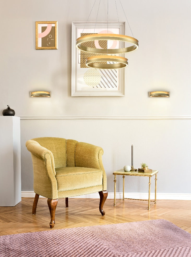 Satin brass double tiered circular LED pendant. Adjustable prior to installation and dimmable with a trailing edge dimmer.