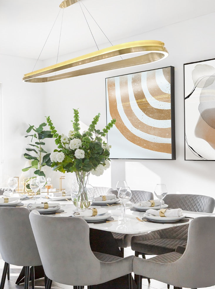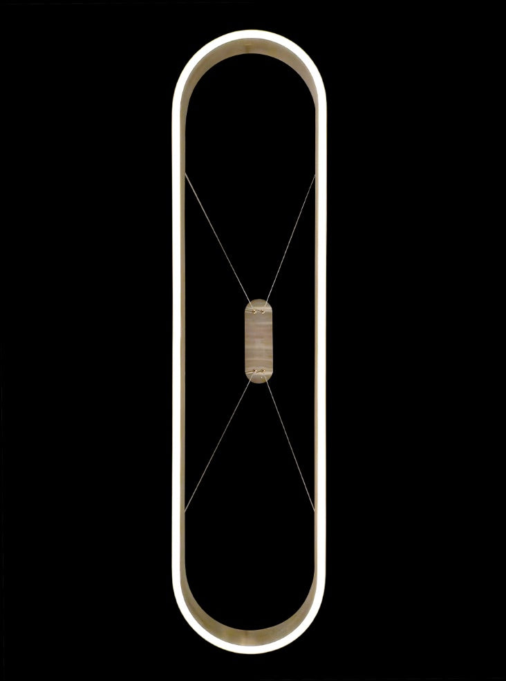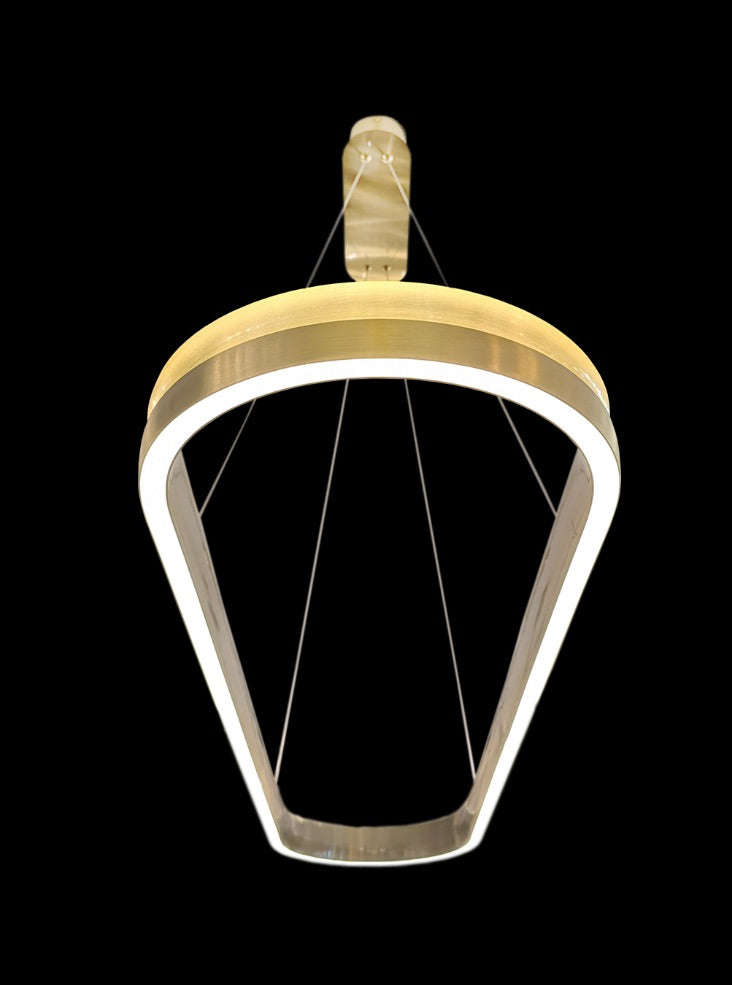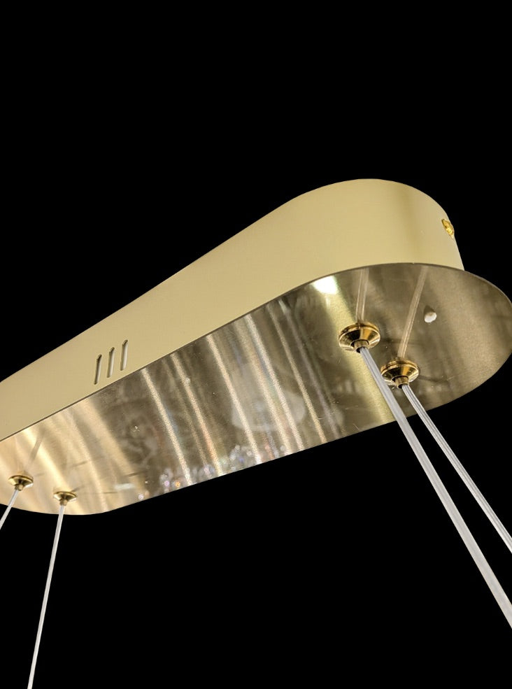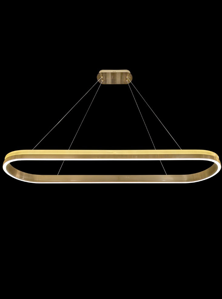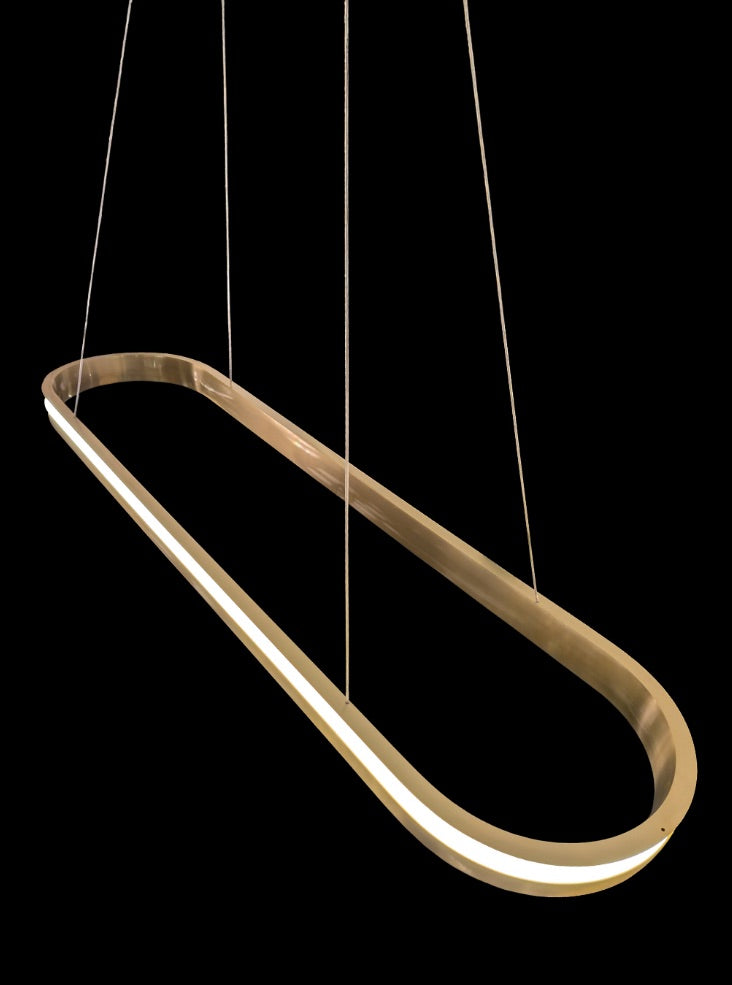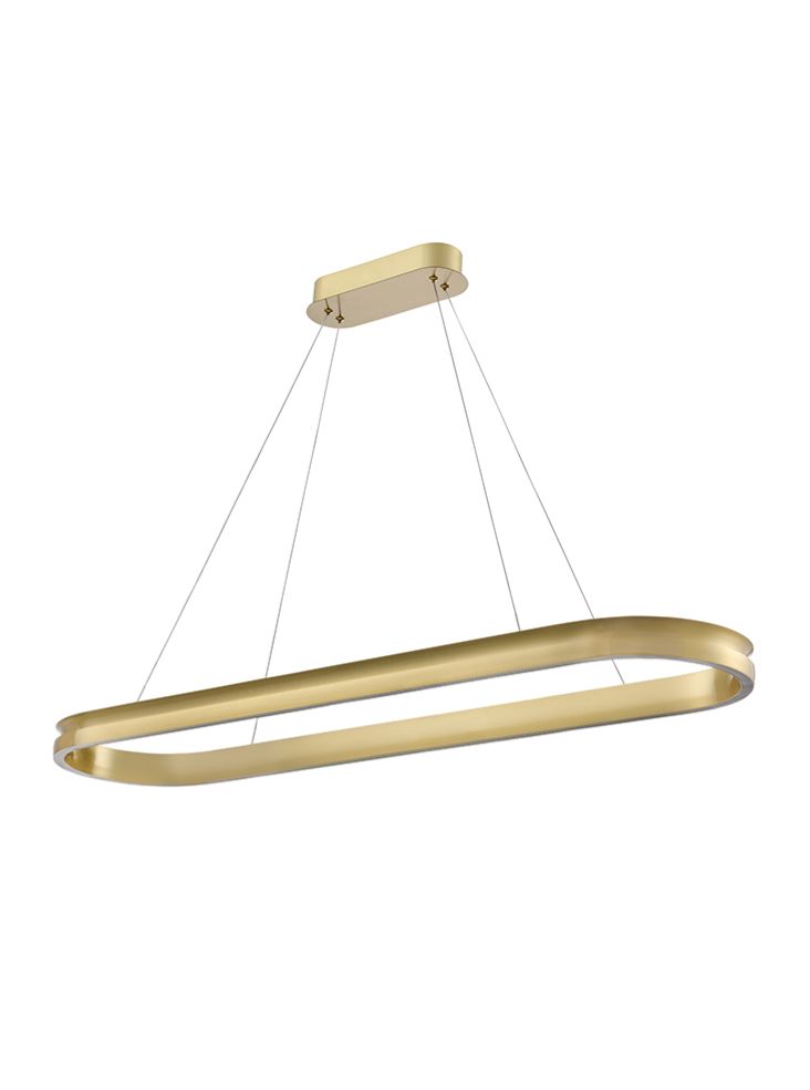 Satin brass single oval tier LED pendant. Adjustable prior to installation and dimmable with a trailing edge dimmer.