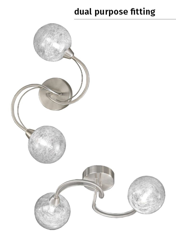 In satin nickel finish with clear glass spheres filled with fixed, spun glass strands . LED G9 lamps should be used. Suitability for dimming will depend both on the lamp and switch used.