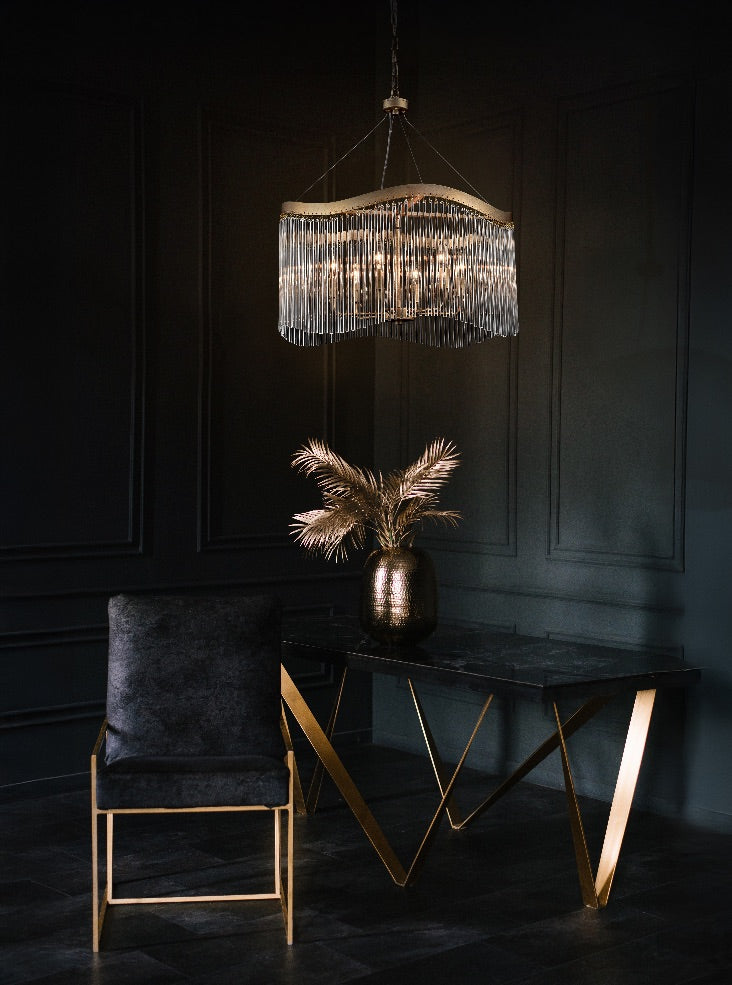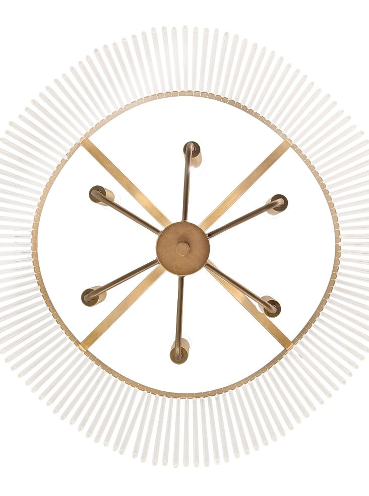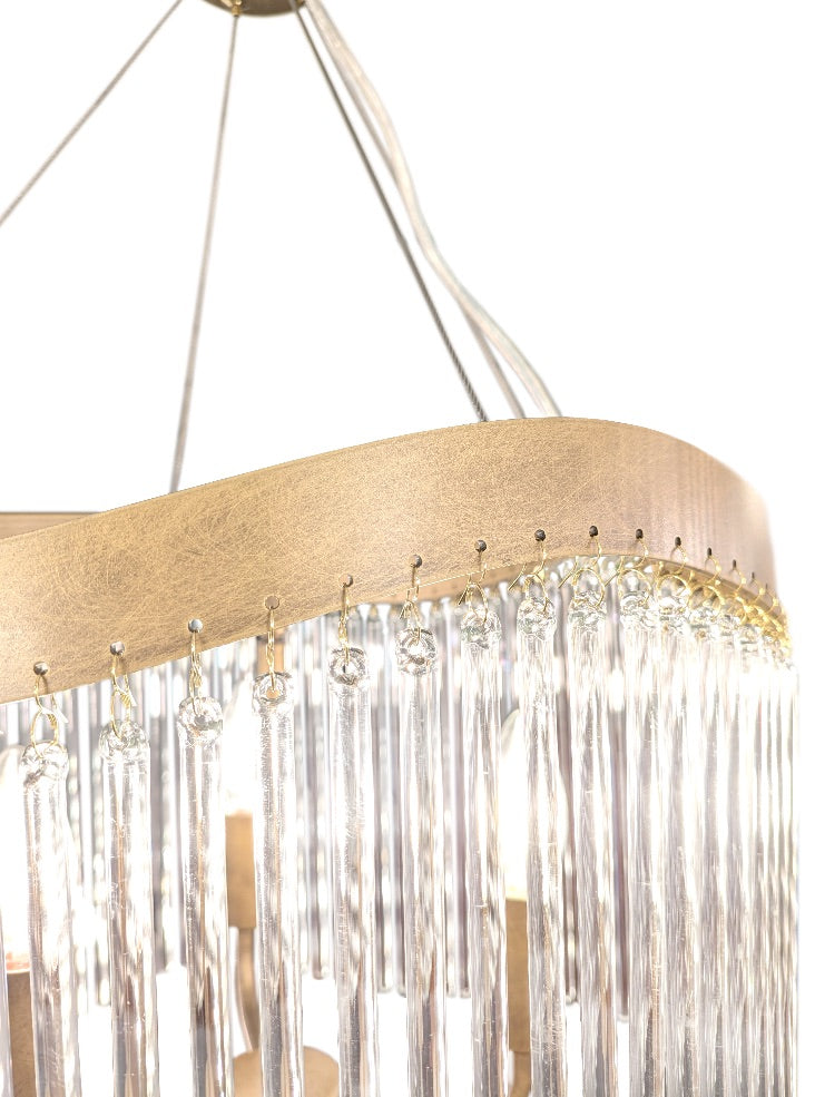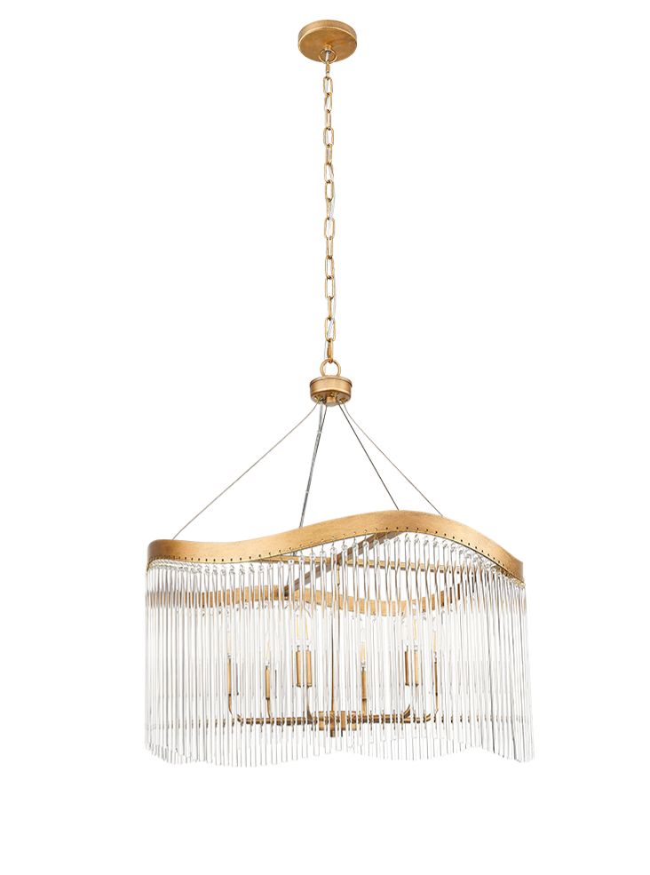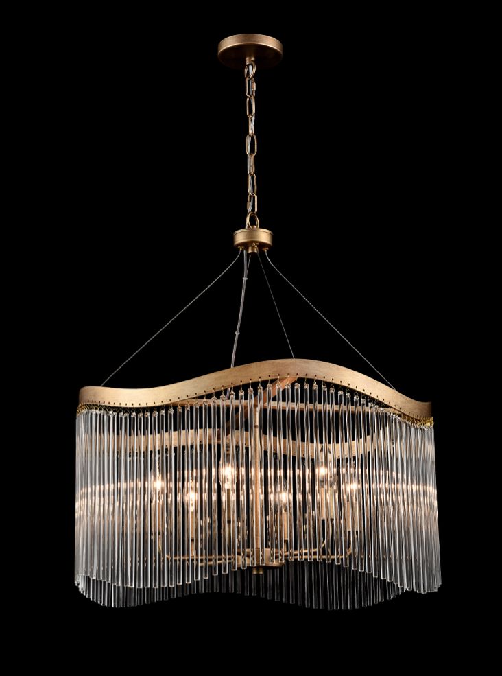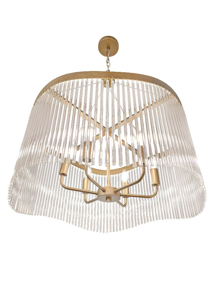 A brushed aged brass finish pendant featuring a curved frame which gives the suspended glass rods a wave effect.
