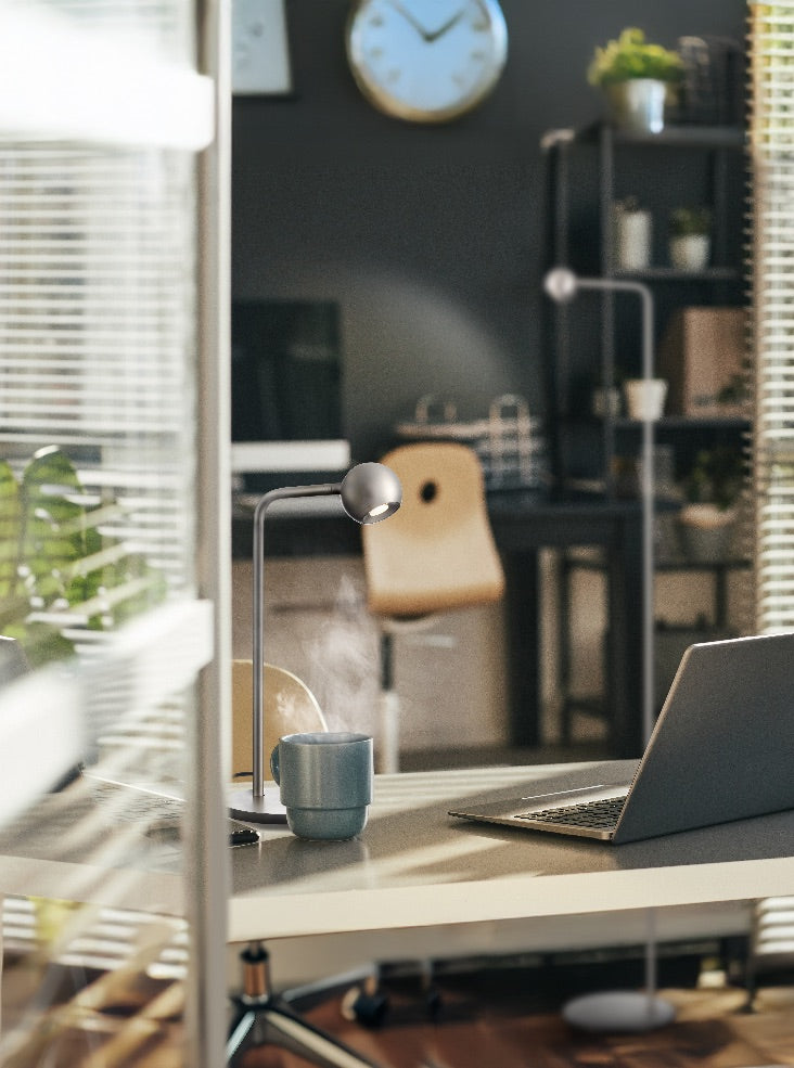 Adjustable satin nickel finish table lamp with in-line switch on the cable. Non-dimmable.