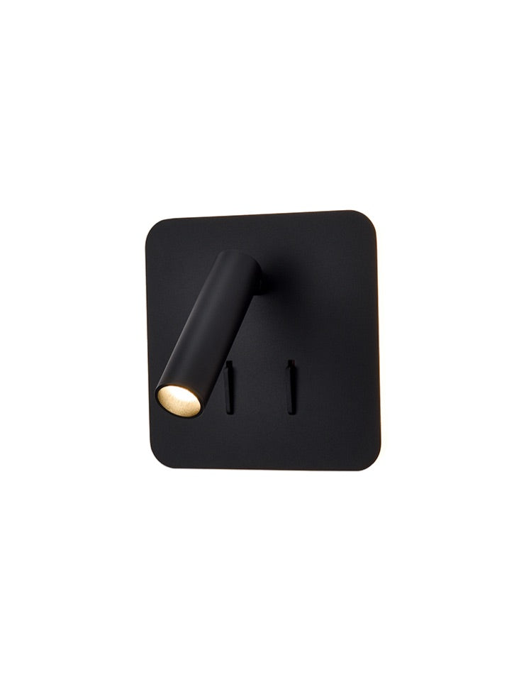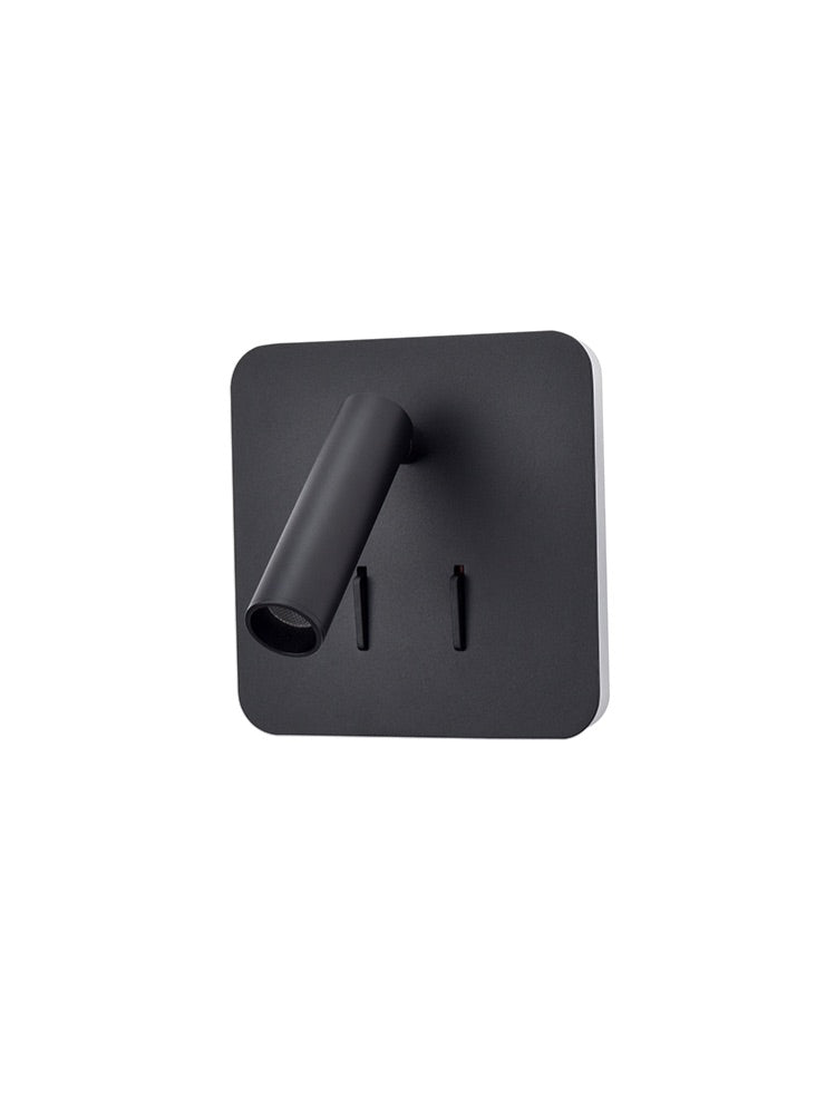 Matt black finish directional LED reading light with an illuminated backplate. There are two switches on the backplate. Non-dimmable.