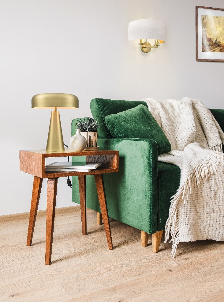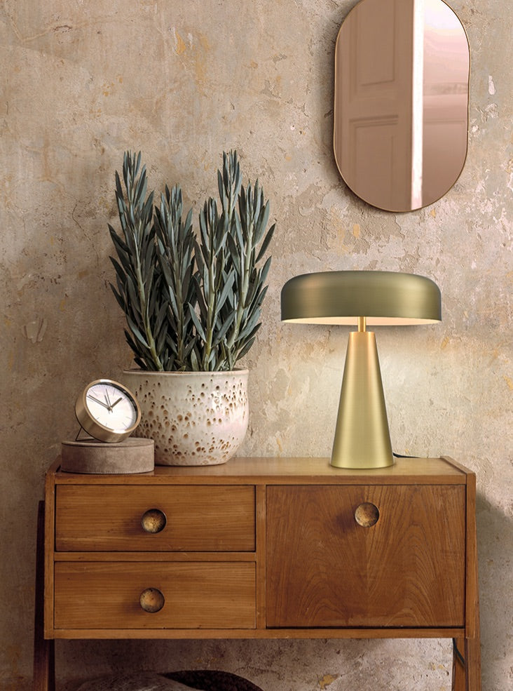 A satin brass finish table lamp. The shade has a white interior and there is an in-line dimmer switch on the cable.
