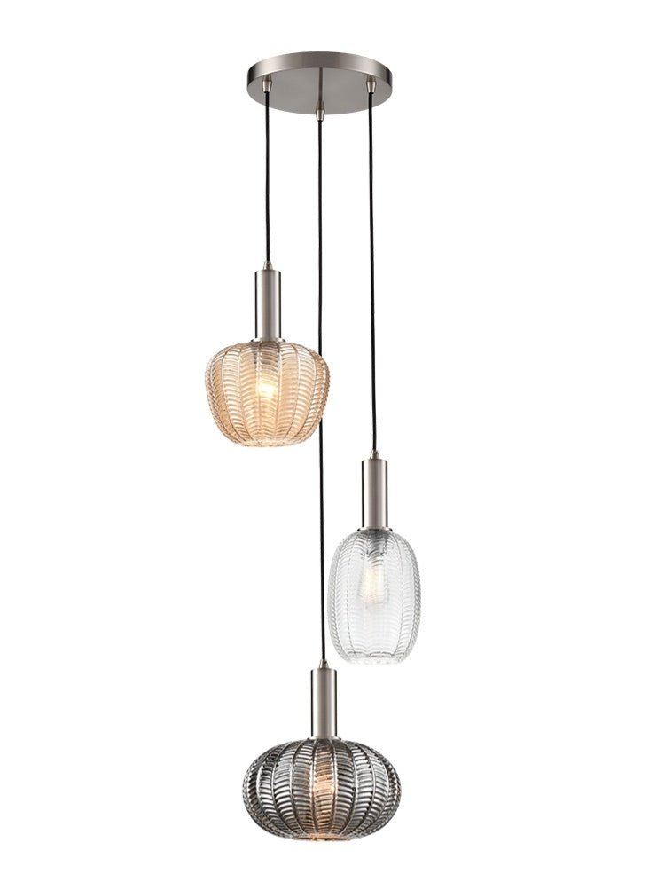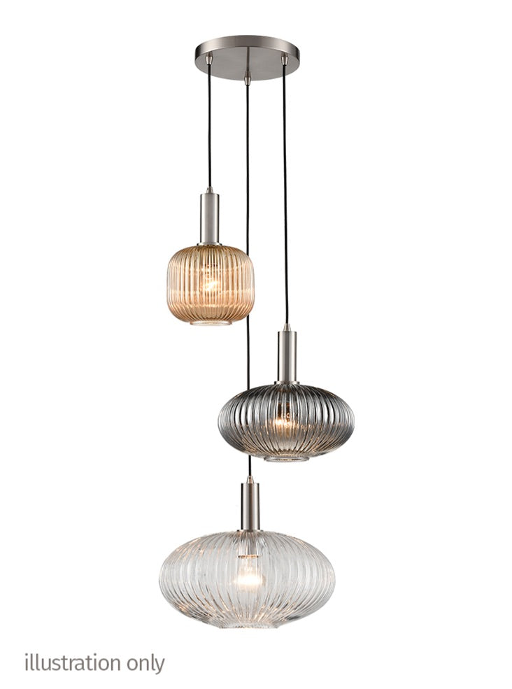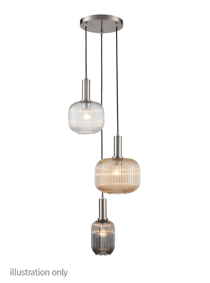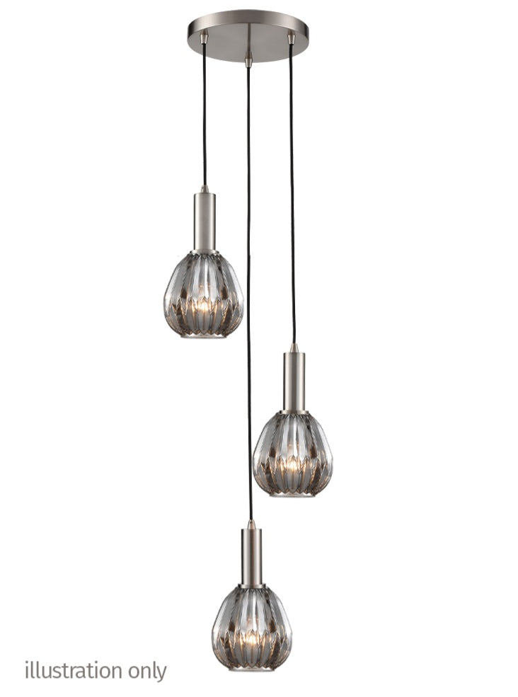 A 3-light fitting with satin nickel finished metalwork and black braided suspensions. The cable lengths are adjustable on site prior to installation. To create your own personal design choose from a wide range of glasses (sold separately).