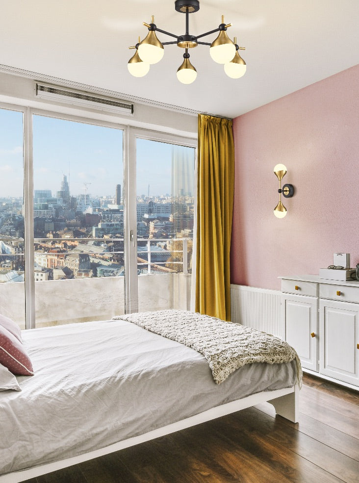 Matt black and aged brass finish 5lt semi flush with teardrop shaped opal glasses.