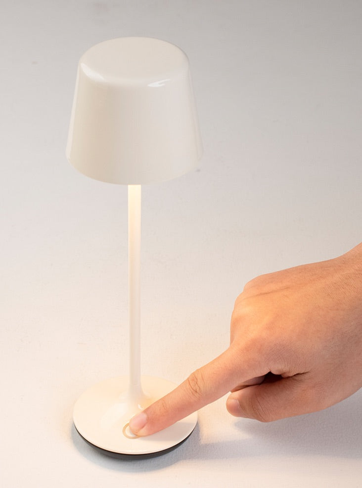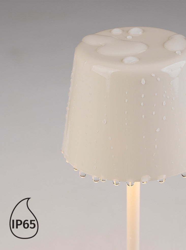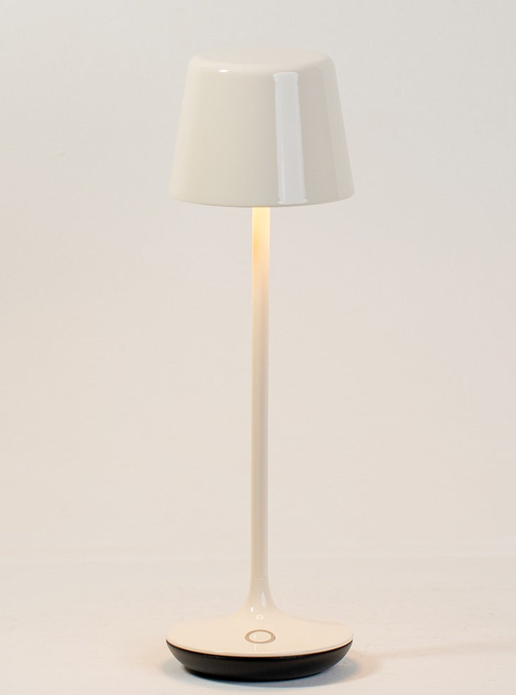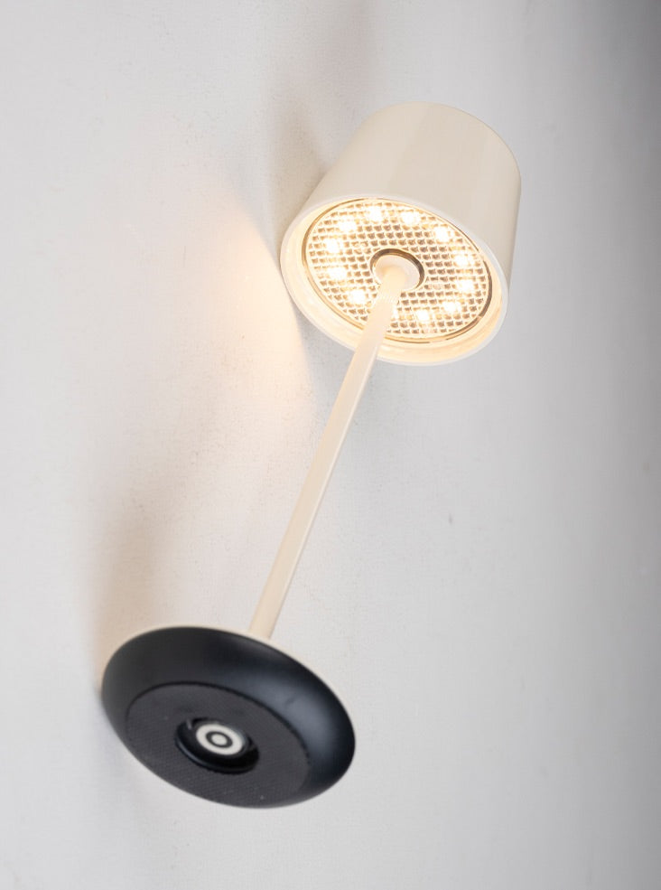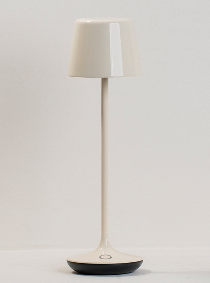 Medium cast aluminium portable table lamps available in ceramic cream finish. Controlled via a switch on the base. Featuring colour temperature options (2200K-2700K) and a dimmer setting memory function that memorises the dimming level. Charged with a single or 6-way charging pad (ordered separately). Rated IP65, these convenient lamps are suitable for interior and exterior use.