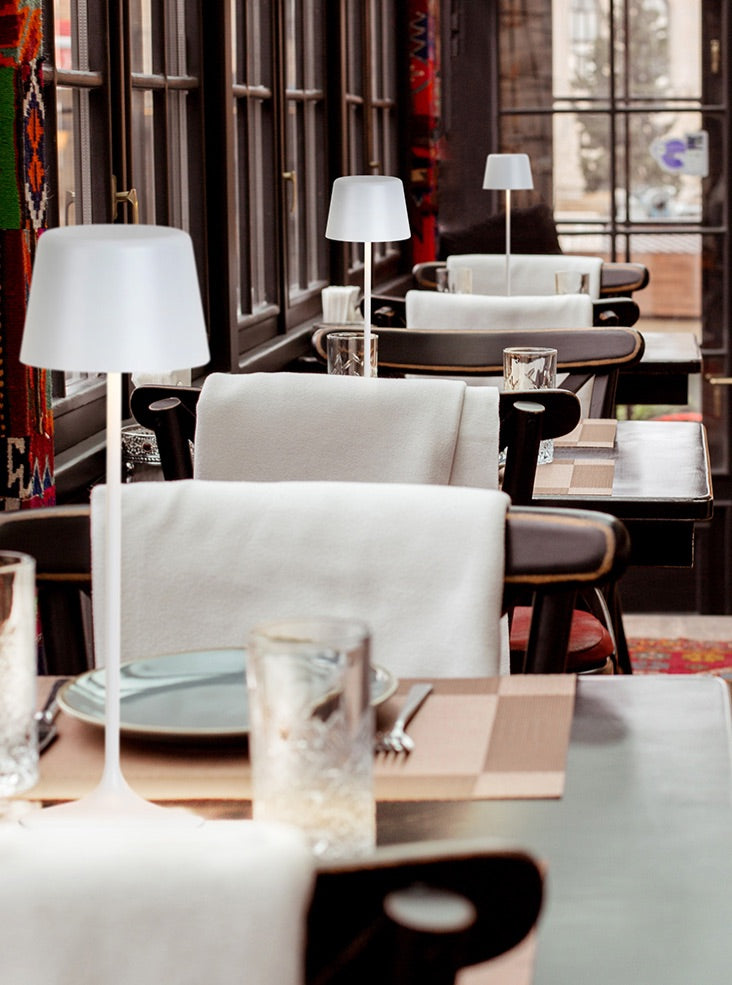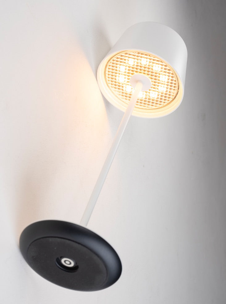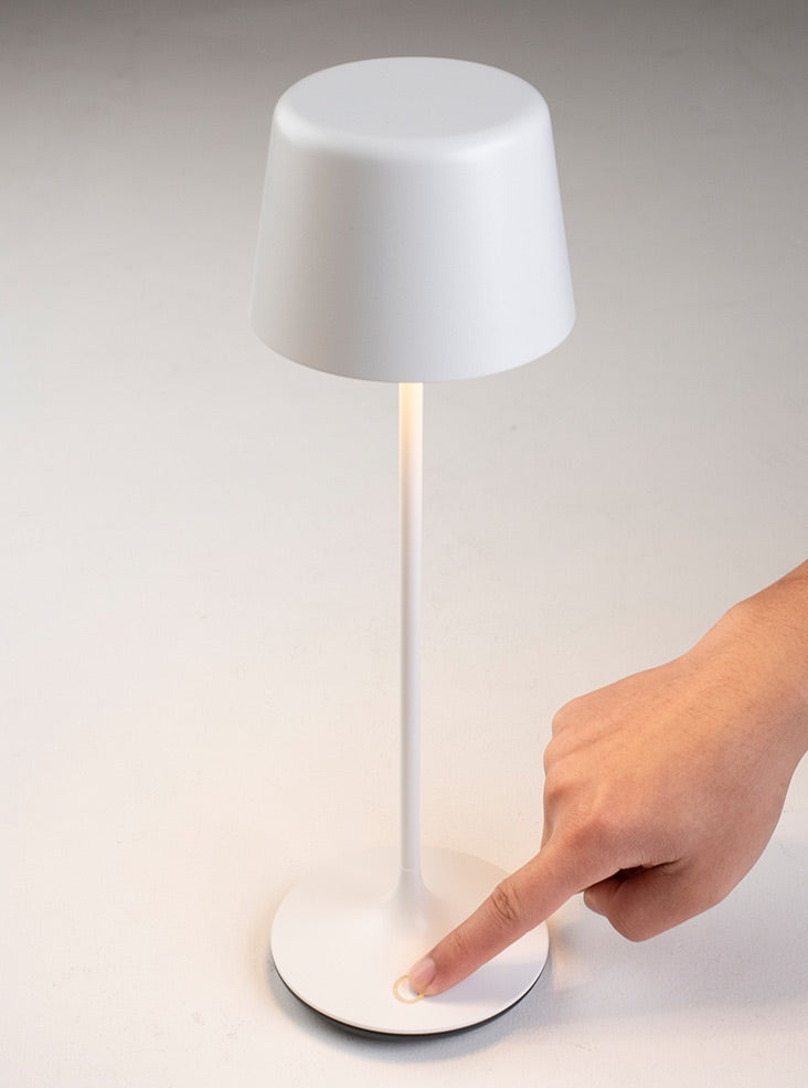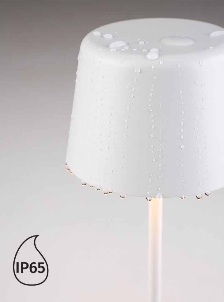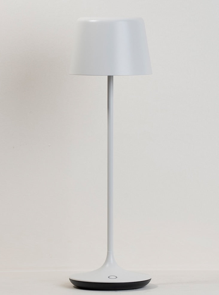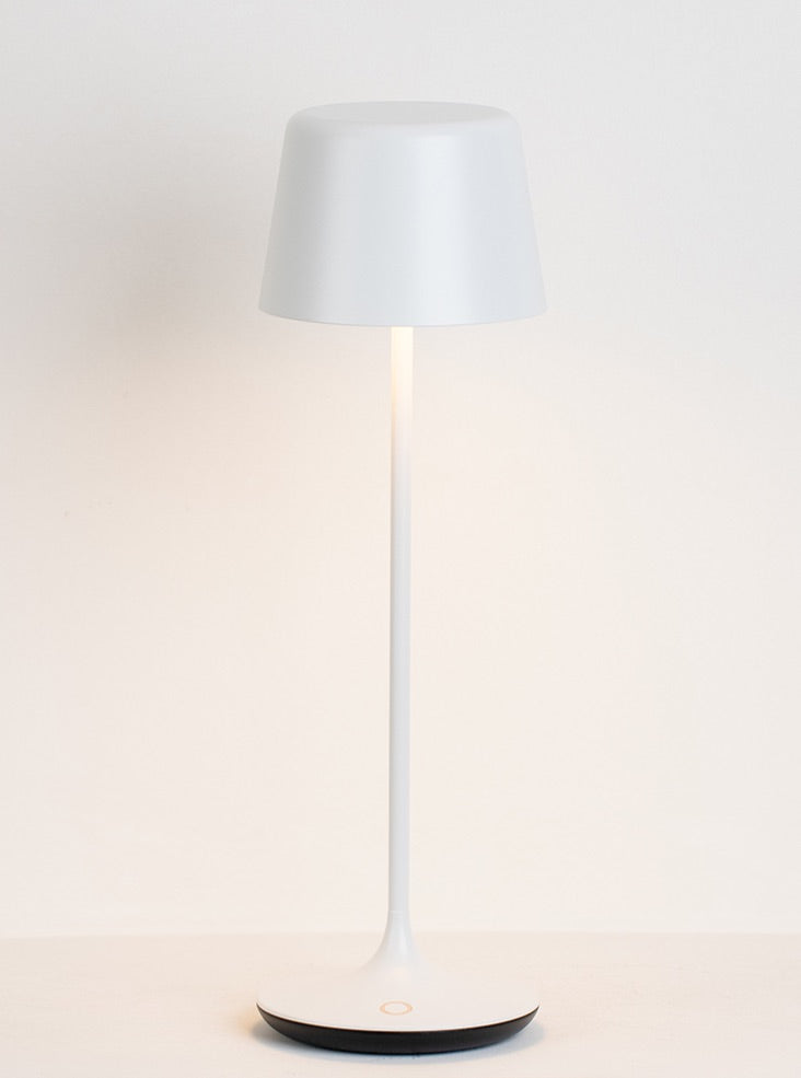 Tall cast aluminium portable table lamps available in matt white finish. Controlled via a switch on the base. Featuring colour temperature options (2200K-2700K) and a dimmer setting memory function that memorises the dimming level. Charged with a single or 6-way charging pad (ordered separately). Rated IP65, these convenient lamps are suitable for interior and exterior use.