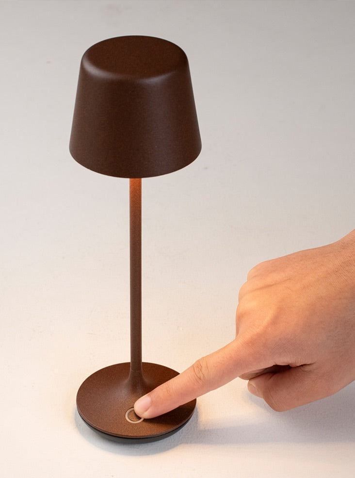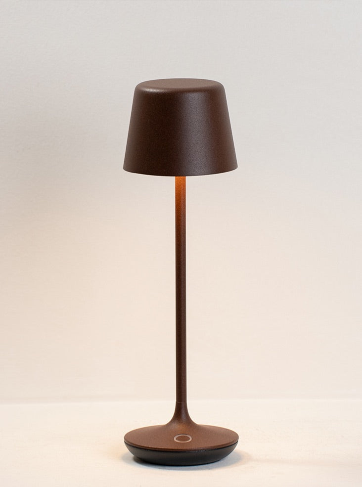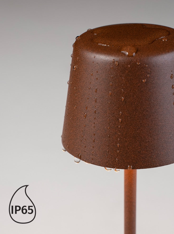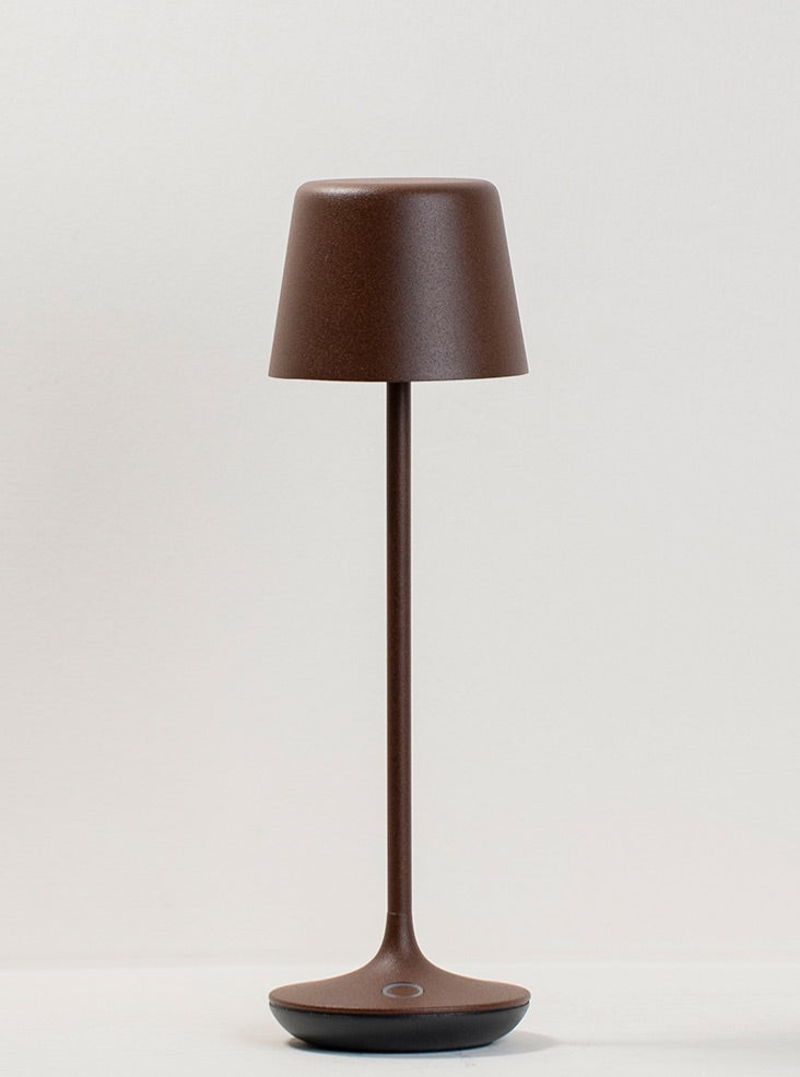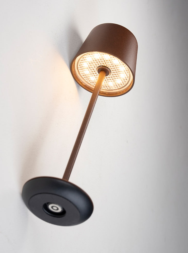 Medium cast aluminium portable table lamps available in rust finish. Controlled via a switch on the base. Featuring colour temperature options (2200K-2700K) and a dimmer setting memory function that memorises the dimming level. Charged with a single or 6-way charging pad (ordered separately). Rated IP65, these convenient lamps are suitable for interior and exterior use.