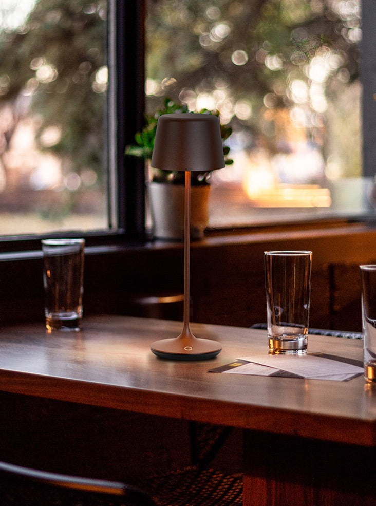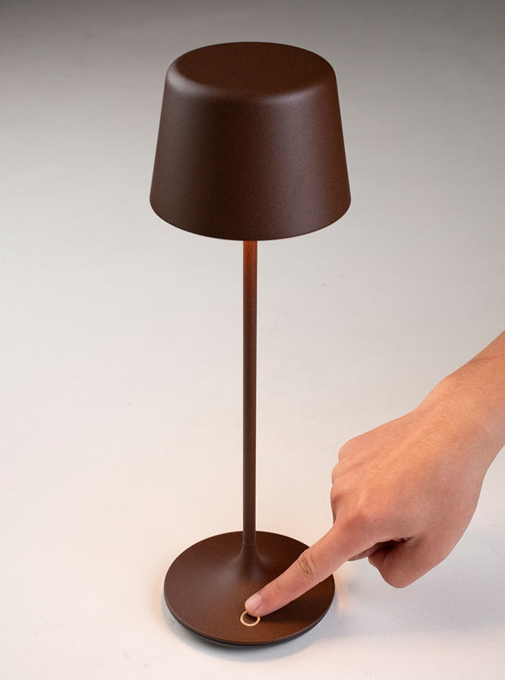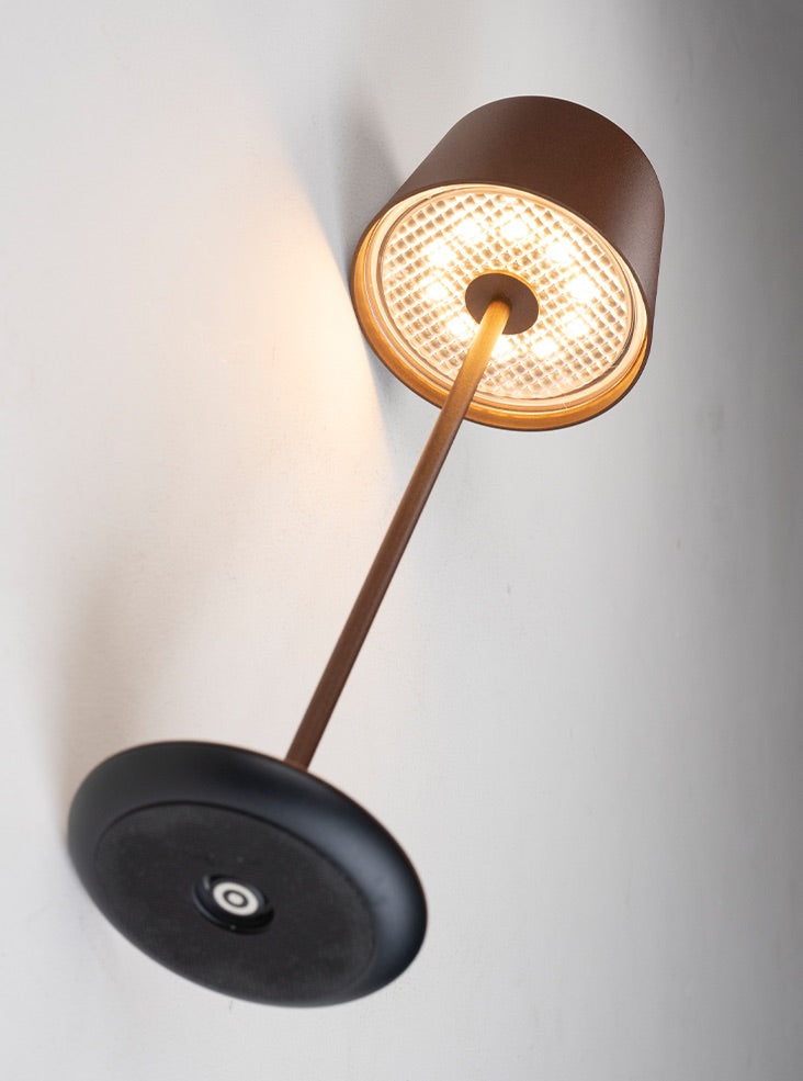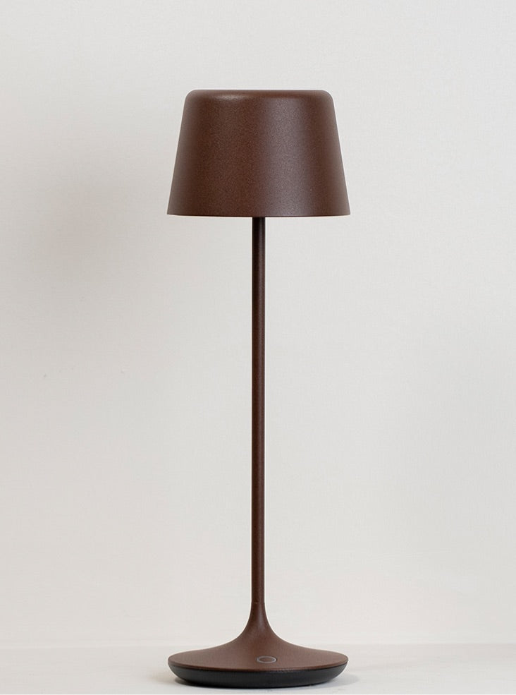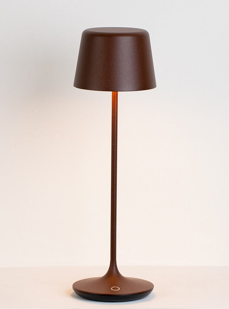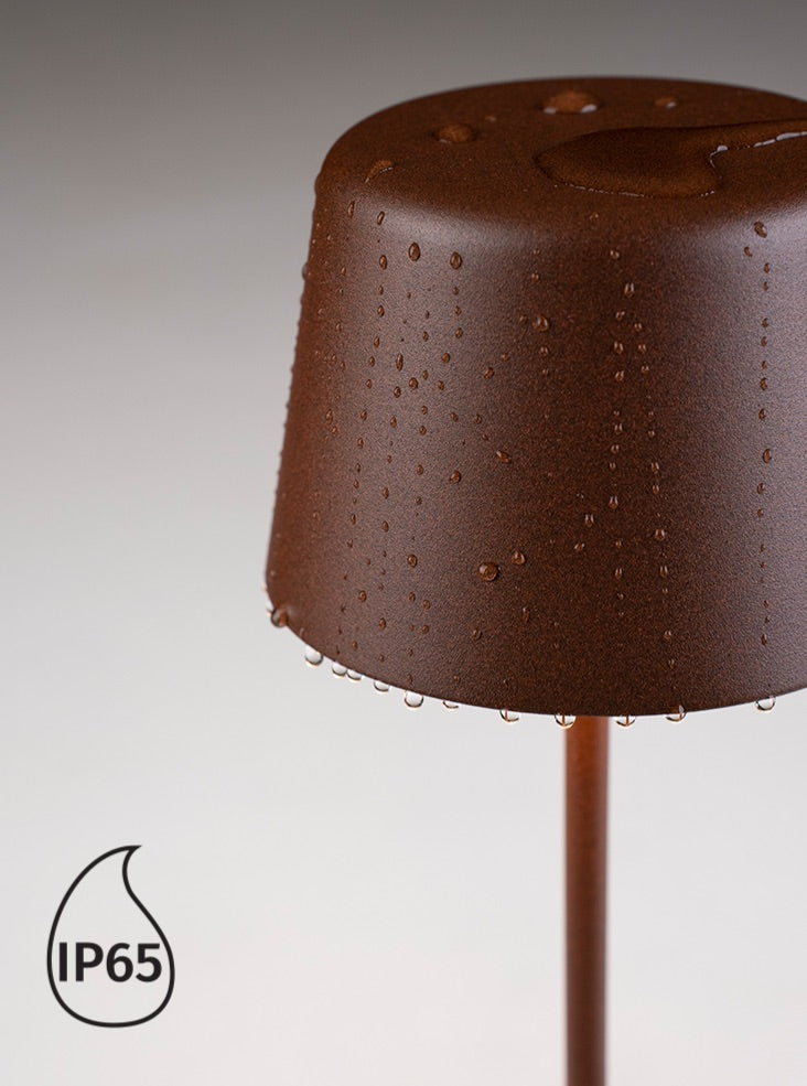 Tall cast aluminium portable table lamps available in rust finish. Controlled via a switch on the base. Featuring colour temperature options (2200K-2700K) and a dimmer setting memory function that memorises the dimming level. Charged with a single or 6-way charging pad (ordered separately). Rated IP65, these convenient lamps are suitable for interior and exterior use.
