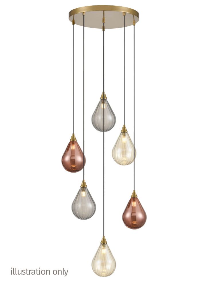 A 6-light fitting with matt gold finished metalwork and black cable suspensions.