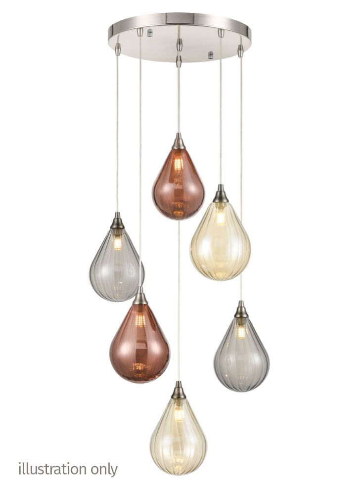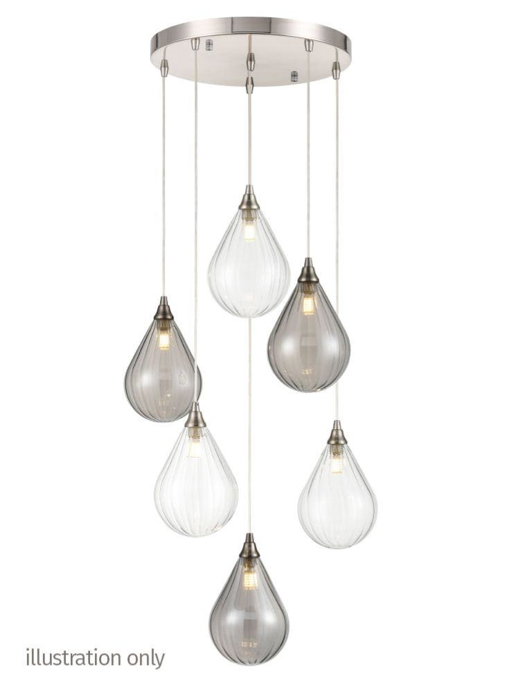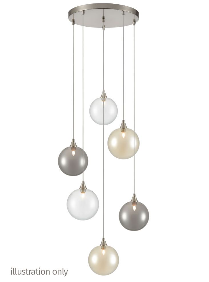 A 6-light fitting with satin nickel finished metalwork and clear cable suspensions.