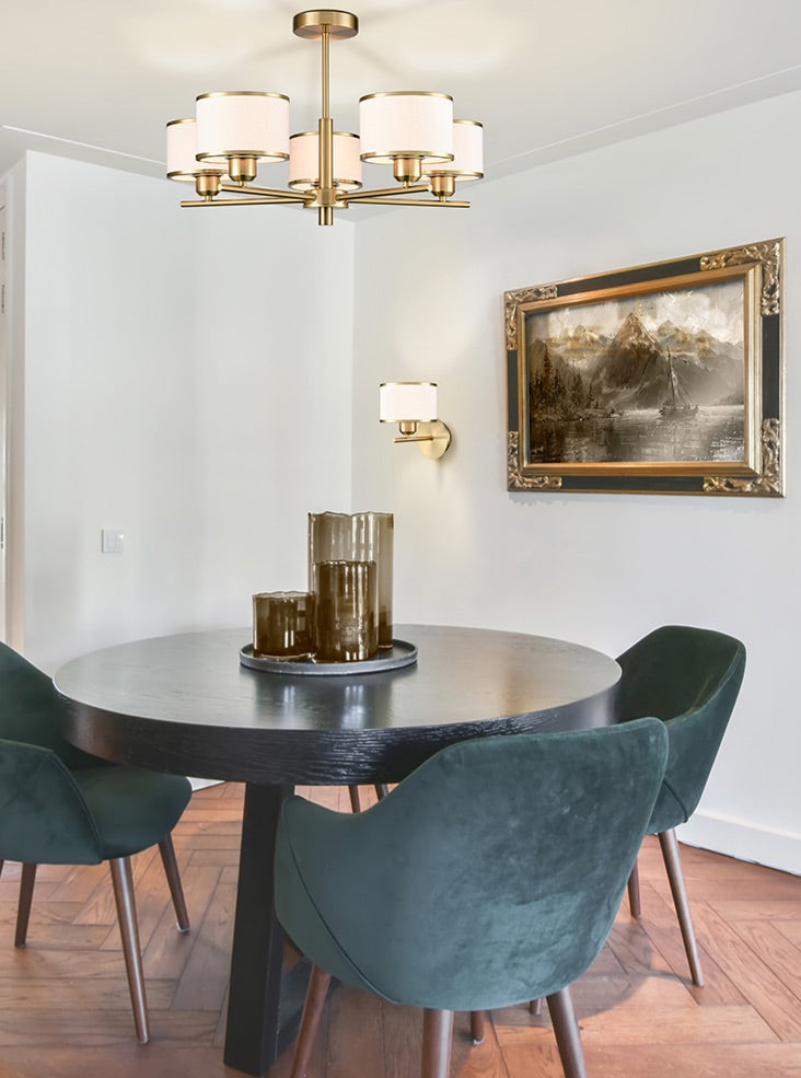 A single wall light in aged brass with a off-white textured fabric shade featuring matching trims.