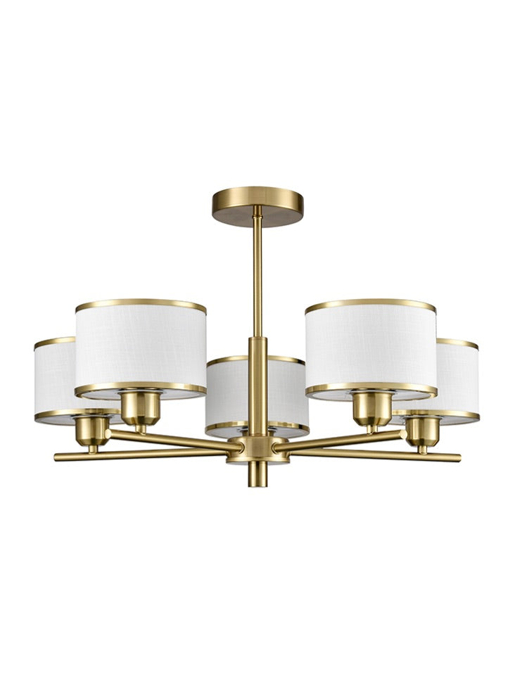 A five light fitting in aged brass finish with off-white textured fabric shades featuring matching trims.