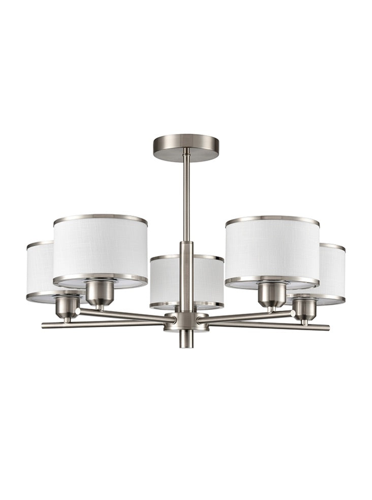 A five light fitting in satin nickel finish with off-white textured fabric shades featuring matching trims.