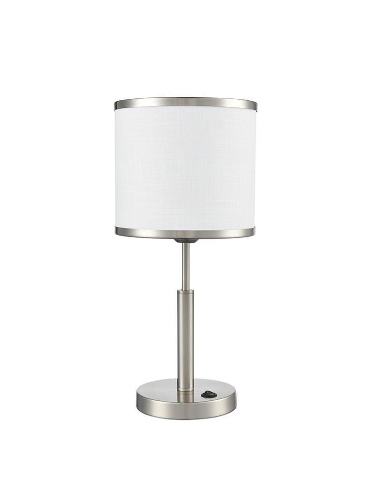 A satin nickel finish table lamp with off-white textured fabric shade featuring matching trims. This table lamp has a switch on the base.
