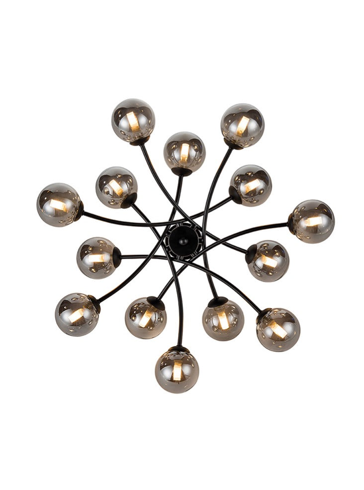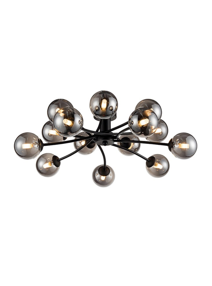A 14-light semi-flush ceiling fitting, finished in matt black with smoke-coloured glass spheres. This fitting is suitable for low ceilings.