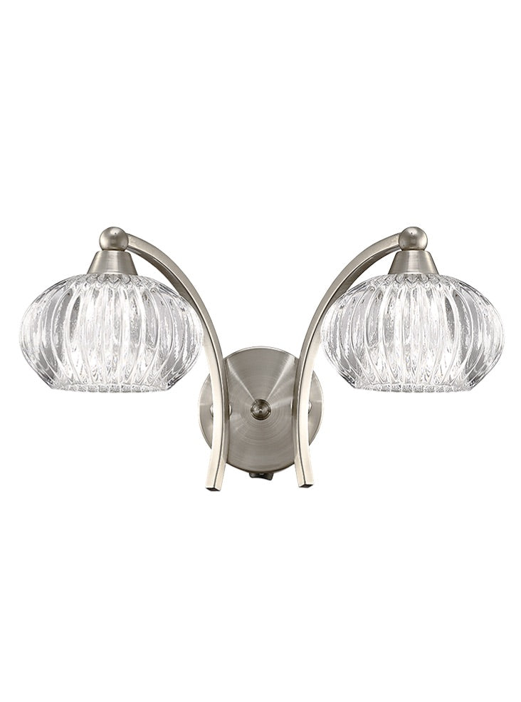 In satin nickel finish with small ribbed glasses and a switch at the base. LED G9 lamps should be used. Suitability for dimming will depend both on the lamp and switch used.