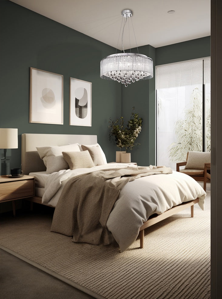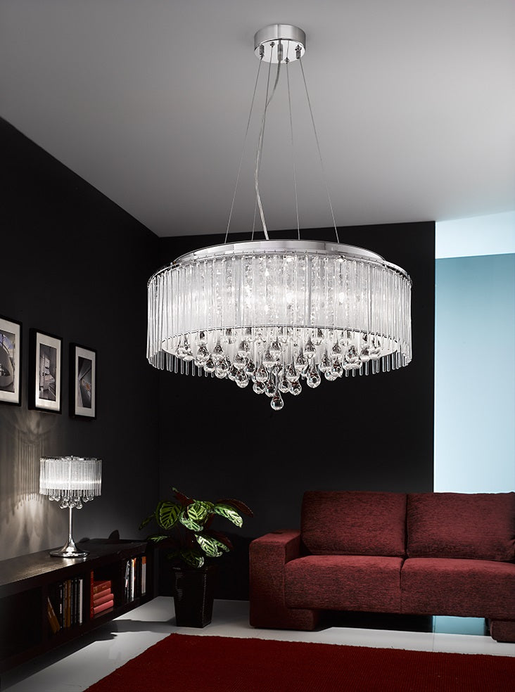 Chrome finish 8 light pendant with small crystal drops inside a lurex fabric shade with glass rod drops. LED G9 lamps should be used. Suitability for dimming will depend both on the lamp and switch used.