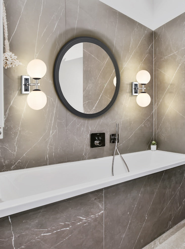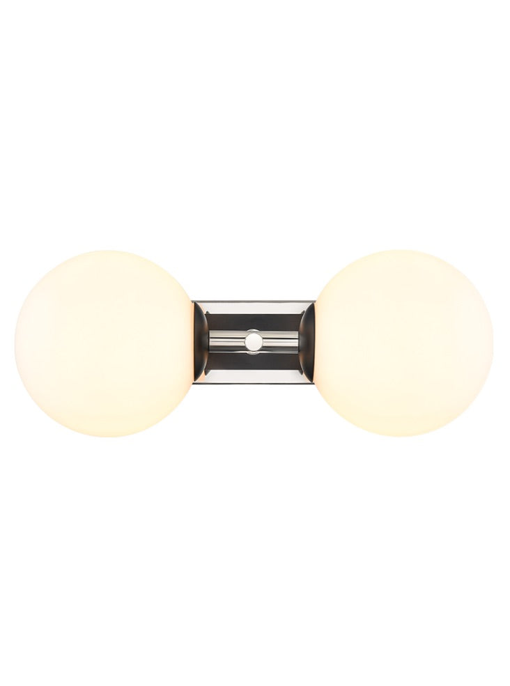 Double wall light in matt black and polished nickel with opal glasses. This versatile range comprises four colours and two designs of sphere glasses.