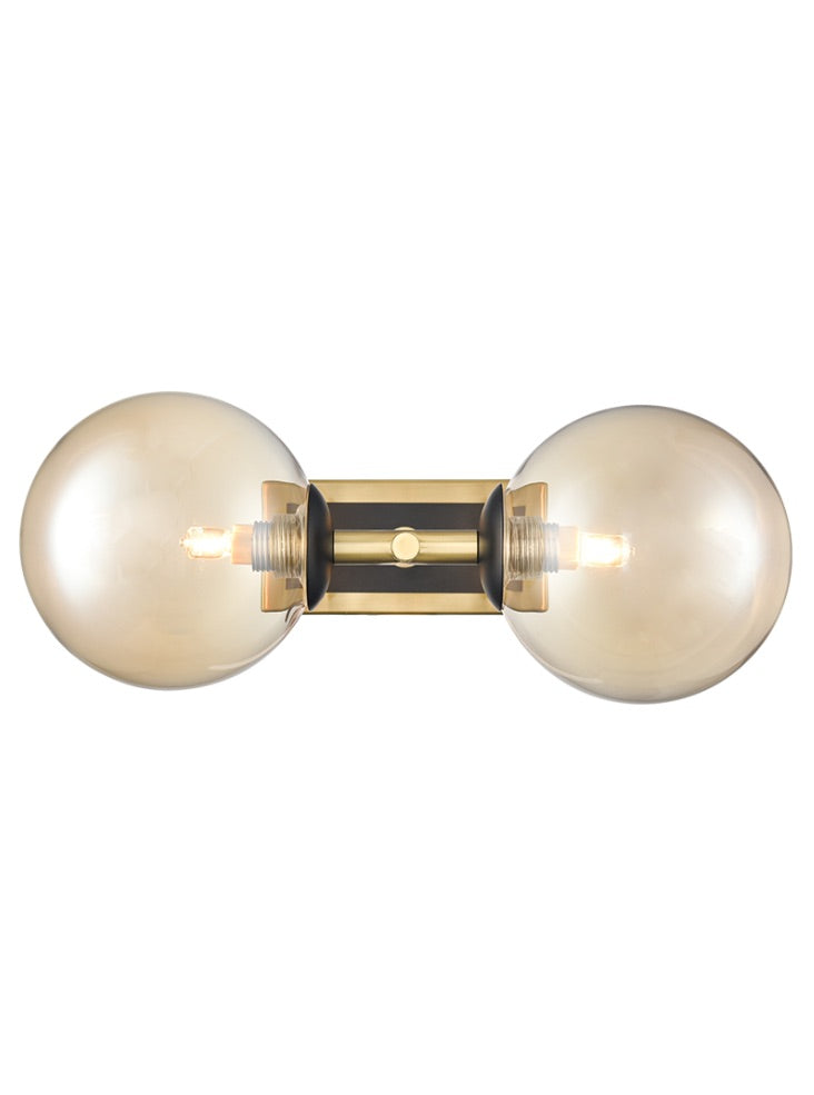 Double wall light in matt black and aged brass finish with amber glasses. This versatile range comprises four colours and two designs of sphere glasses.