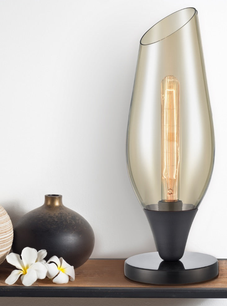 Matt black finish table lamp on a marble base with an in-line switch on the cable and amber glass.