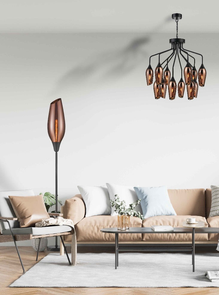 Matt black finish floor lamp on a marble base with an in-line switch on the cable and and copper glass.