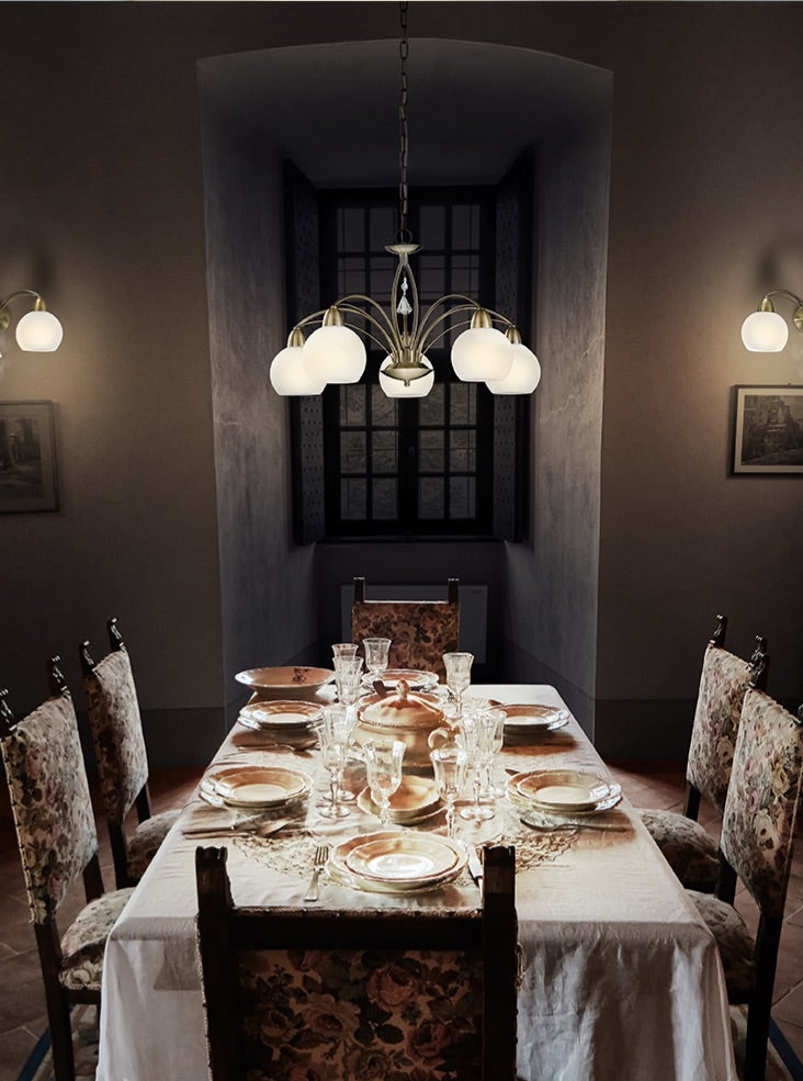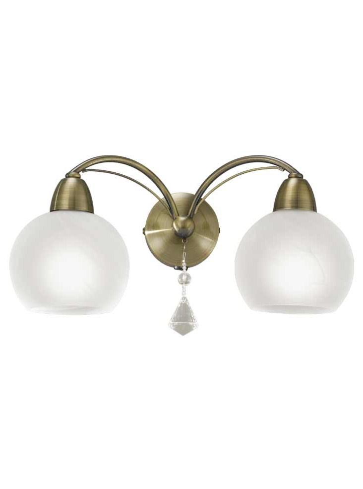 In bronze finish with alabaster effect glasses and a faceted crystal drop. There is a switch on the backplate