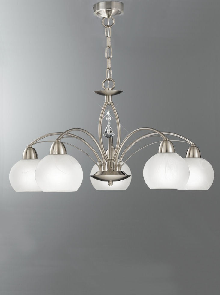 In satin nickel finish with alabaster effect glasses and a faceted crystal drop.