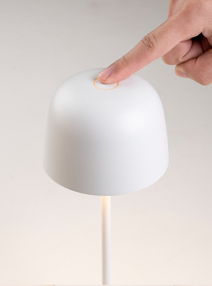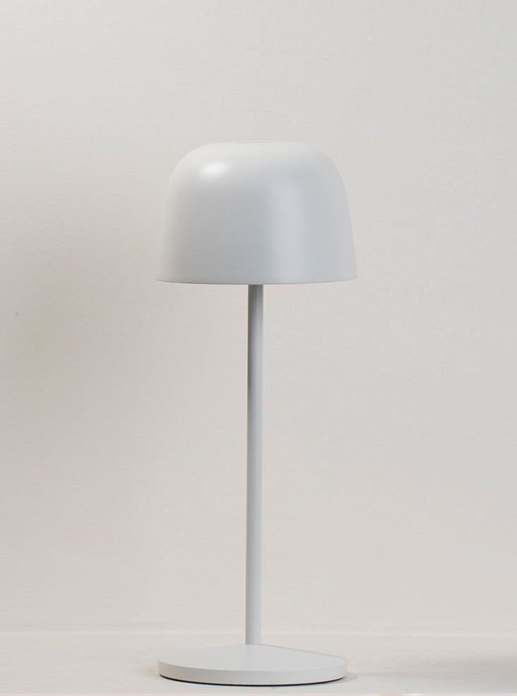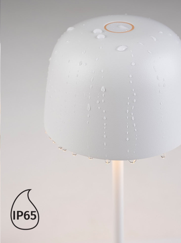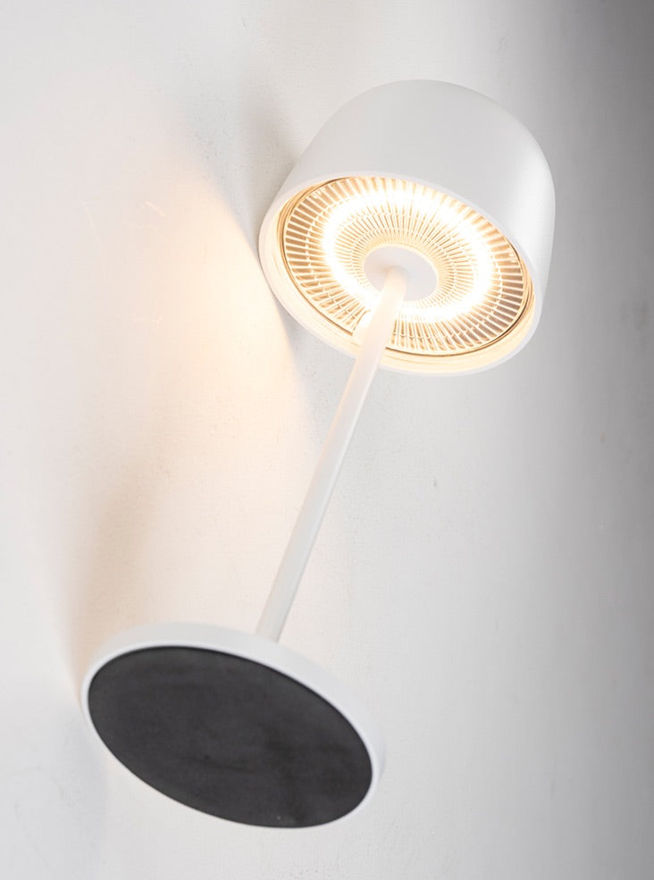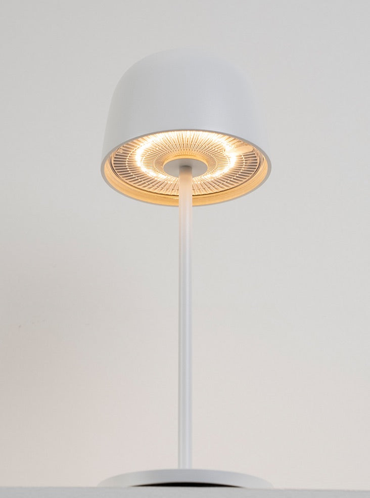 Cast aluminium portable table lamps finished in matt white finish. Controlled via a switch on the top of the shade. Featuring a dimmer setting memory function that memorises the dimming level. Charged with a USB Type-C cable. Rated IP65, these convenient lamps are suitable for interior and exterior use. Non-dimmable.
