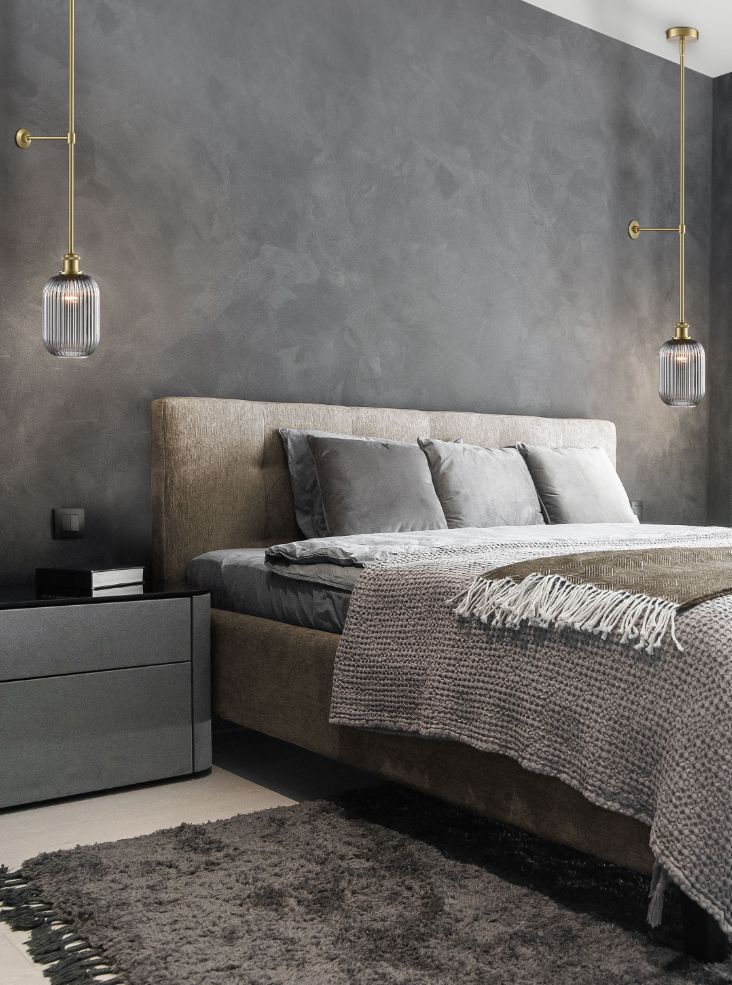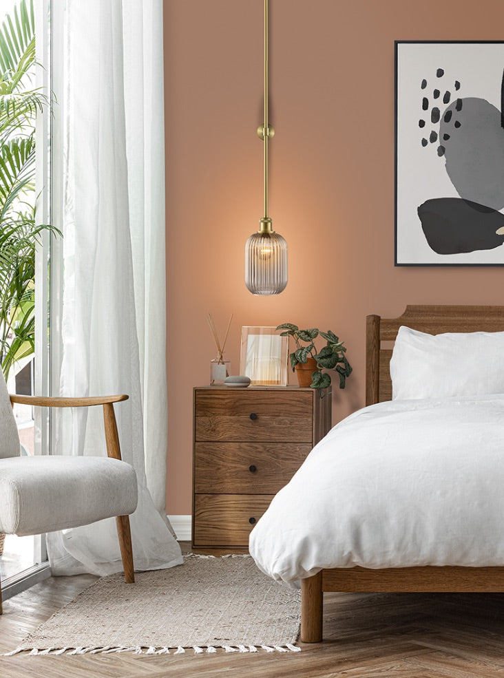 Aged brass finish pendant with securing wall mount. Available with a choice of ribbed glasses in three colours and three shapes. Illustrated with smoked ribbed glass. Supplied with three rods; 3x 560mm. Any combination of these rods can be used to vary the height of the fitting.