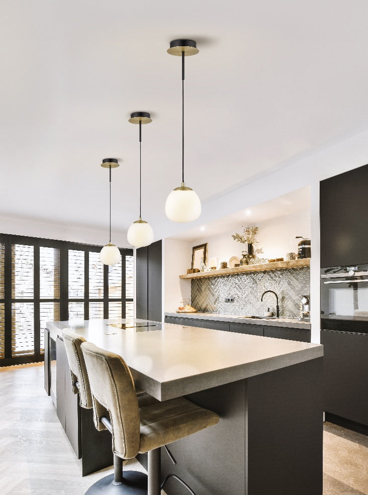 Matt black and gold finish pendant with opal glasses. The single fitting is supplied with an adjustable cable and can be used as a pendant or wall bracket.