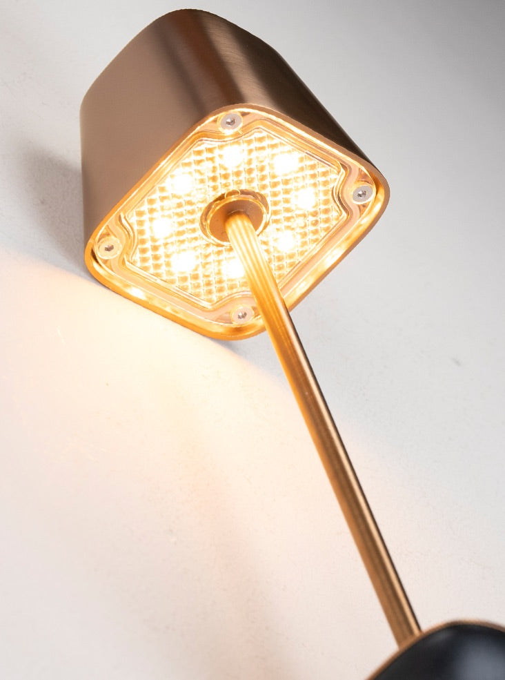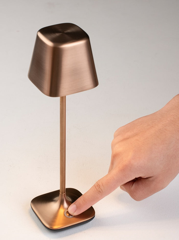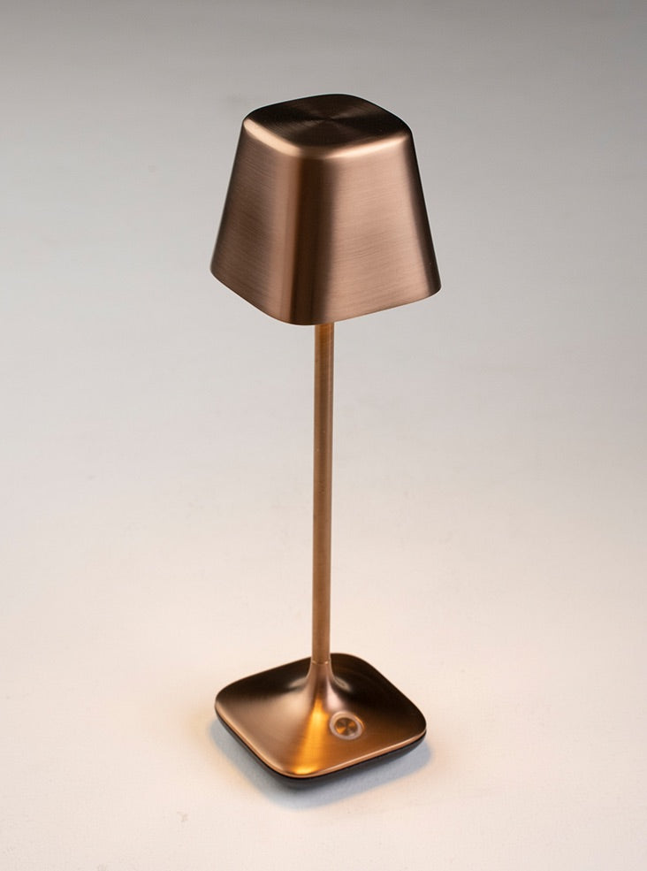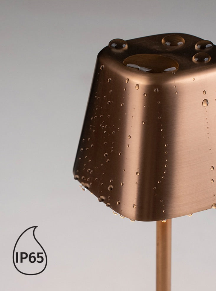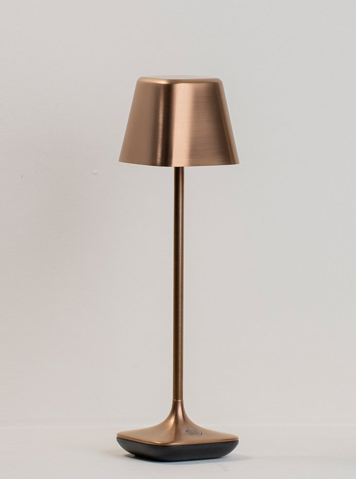 Small cast aluminium portable table lamps in a brushed bronze finish. Controlled via a switch on the base. Featuring colour temperature options and a dimmer setting memory function that memorises the dimming level. Charged via a single or 6-way charging pad (ordered separately). Rated IP65, these convenient lamps are suitable for interior and exterior use.