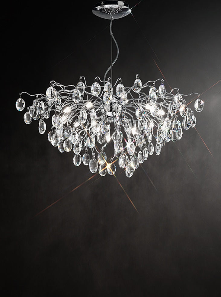 In chrome finish with a mass of heavy crystal glass drops. LED G9 lamps should be used. Suitability for dimming will depend both on the lamp and switch used.