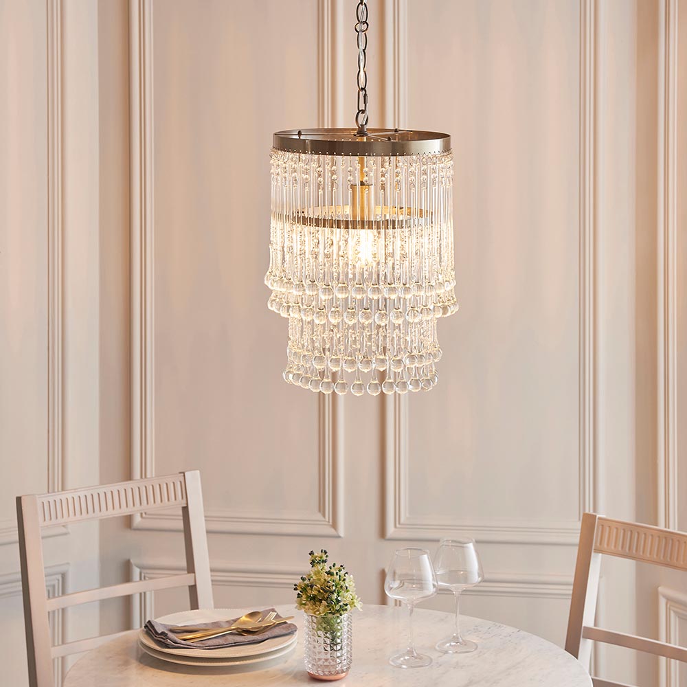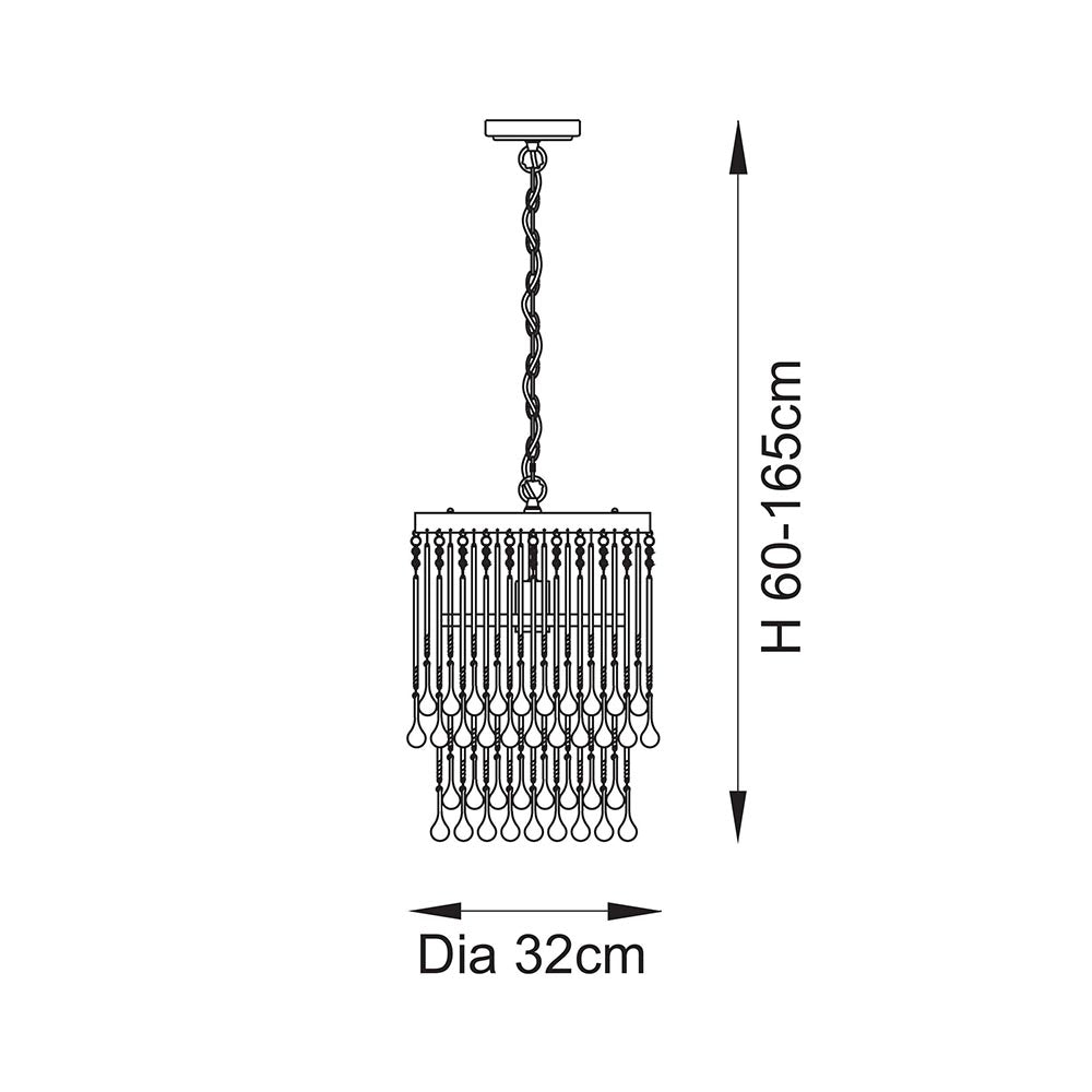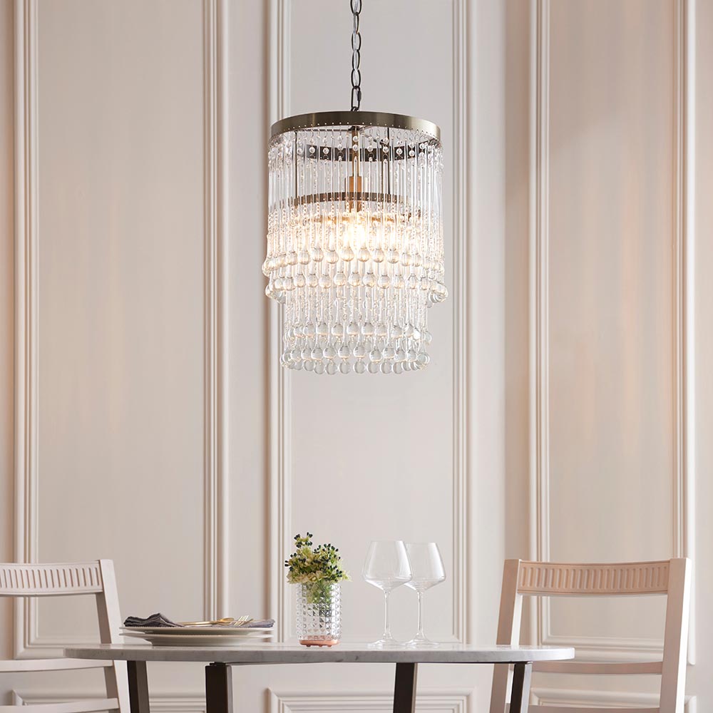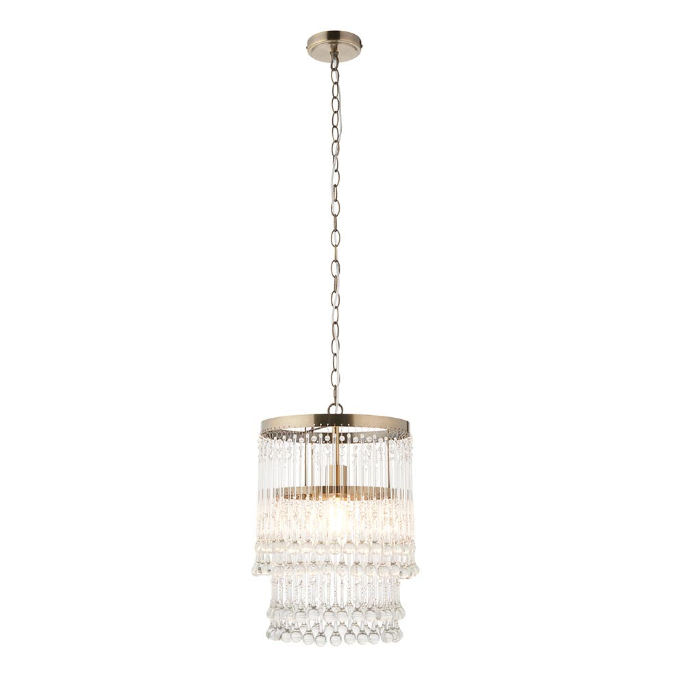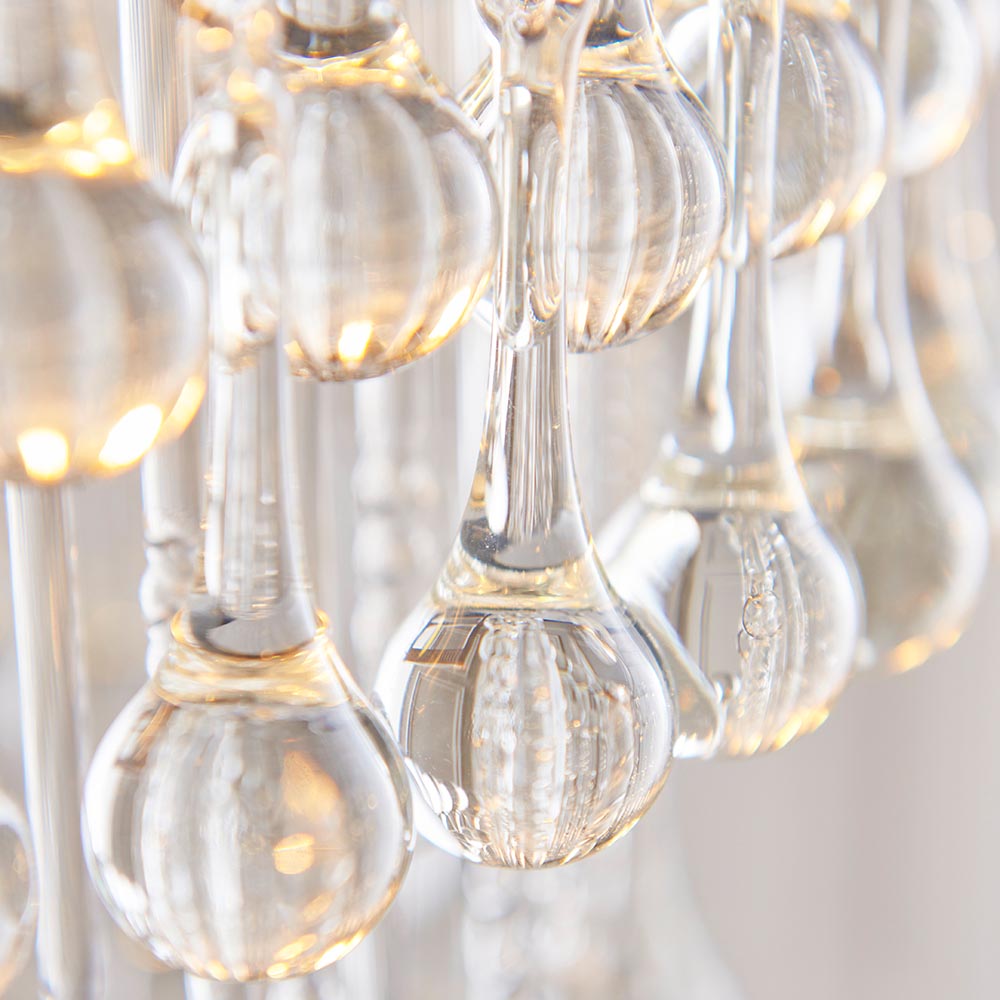 A beautifully decorative array of clear glass droplets suspended from an elegant antique brass plated frame.