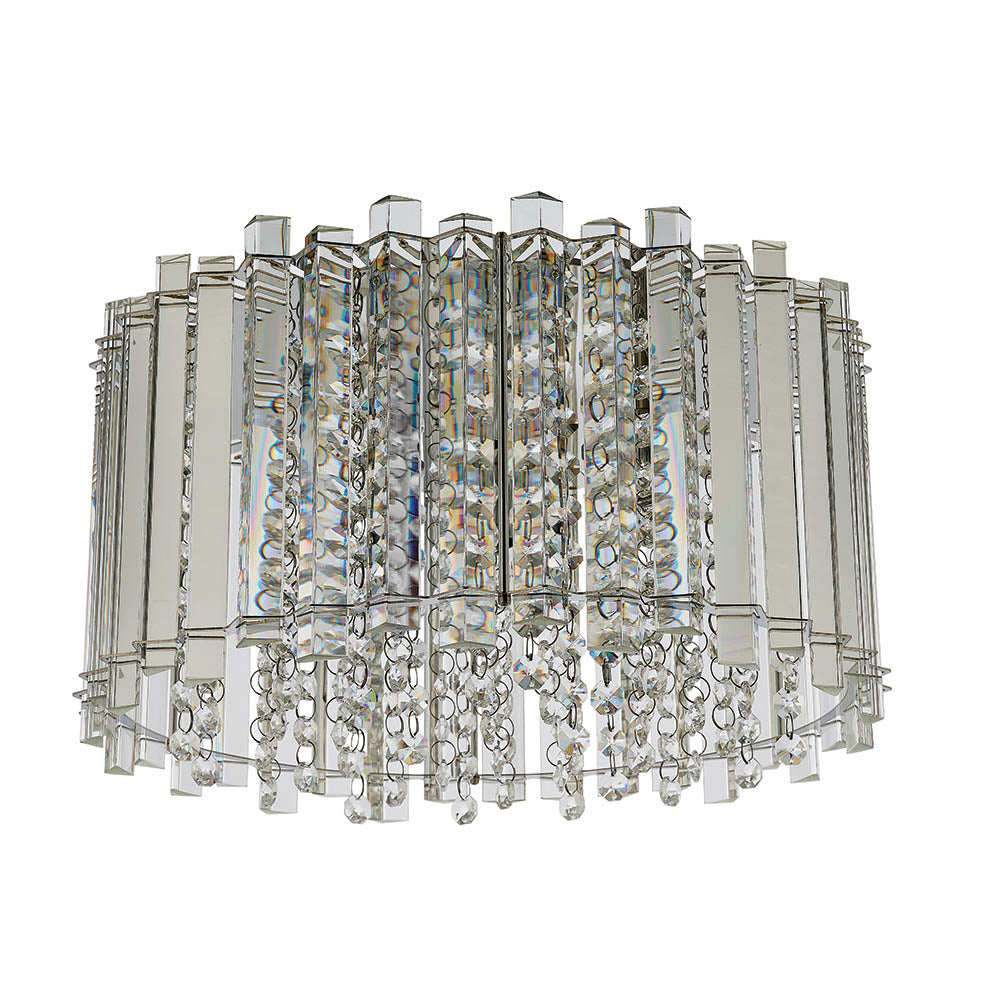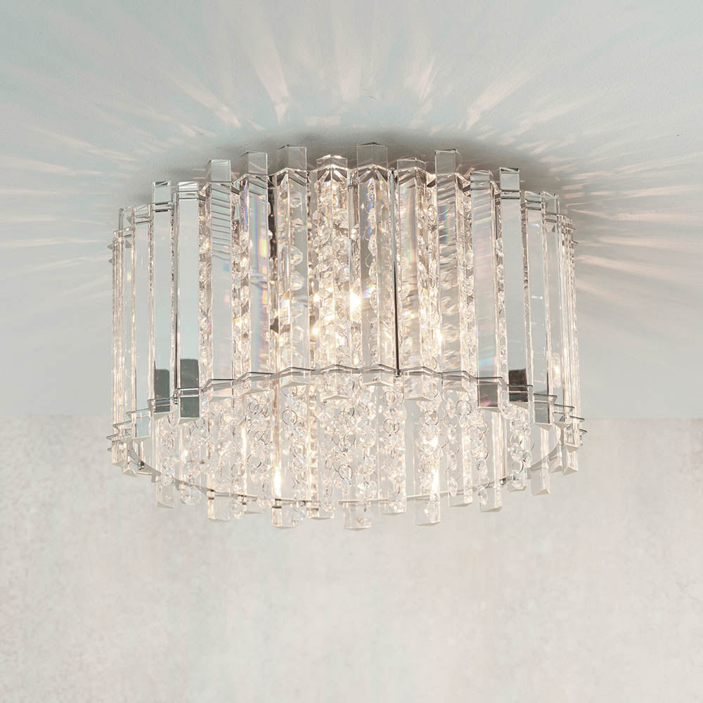A beautiful high quality, reflective clear crystal ceiling light, filled with faceted glass droplets for an opulent addition to the most loved interiors of your home. Complete the look with the matching ceiling pendant and wall light.4 x 28w G9 clear capsule (recommended) Proj: 220mm Dia: 360mm Class 2