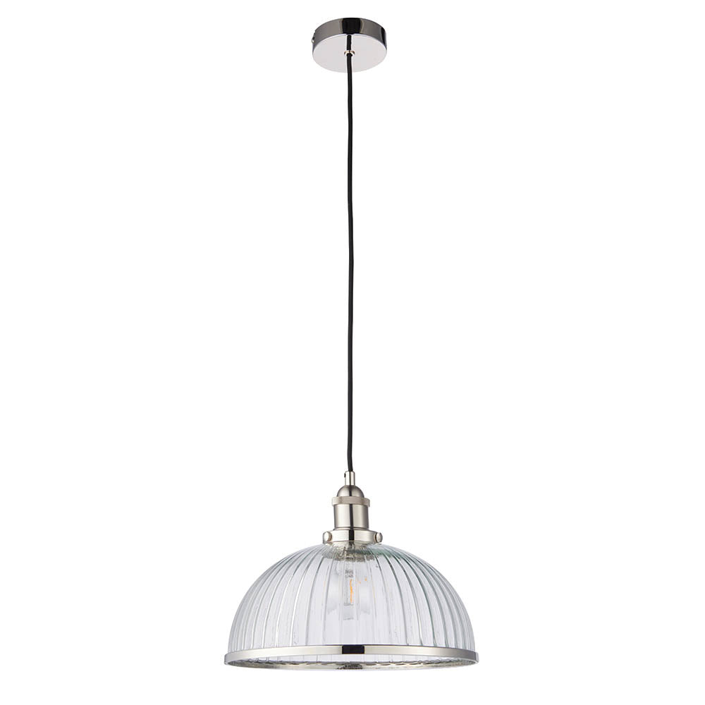 - Clear ribbed glass shade with metal rim