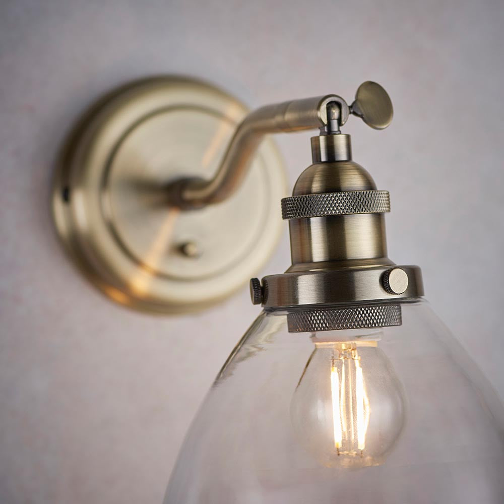 An authentic 'resto' style adjustable wall light, finished in antique brass plating with authentic knurled lamp holder details and clear glass shades . Featuring an adjustable knuckle and accessible on/off switch, pair this wall light with filament LED lamps for that perfect industrial style. The perfect addition for today's stylish homes to create that on trend bar, bistro look.