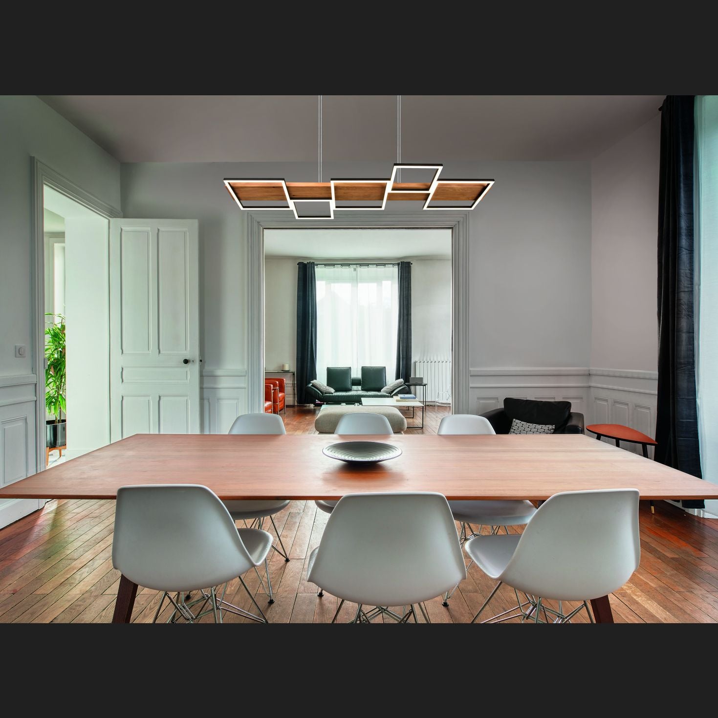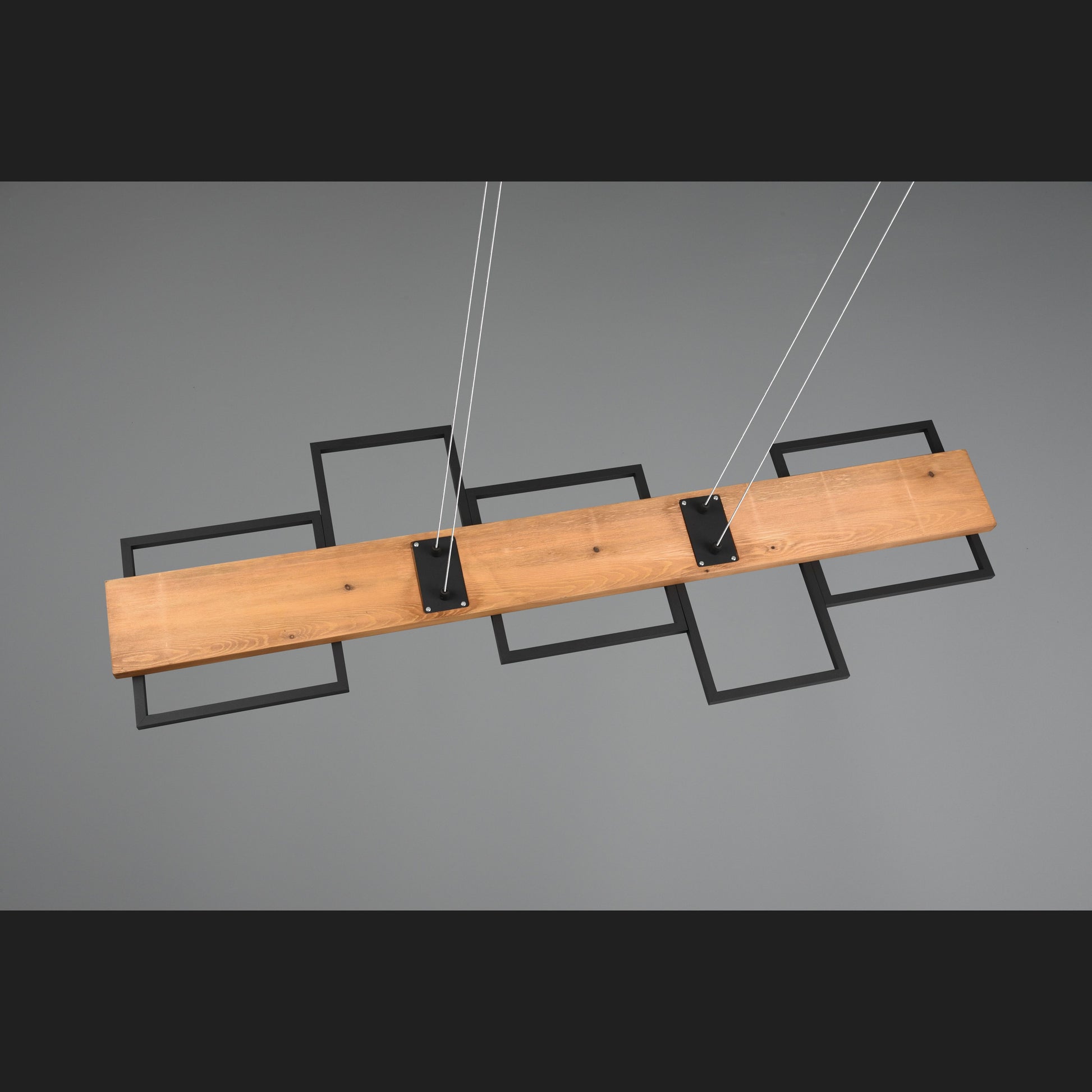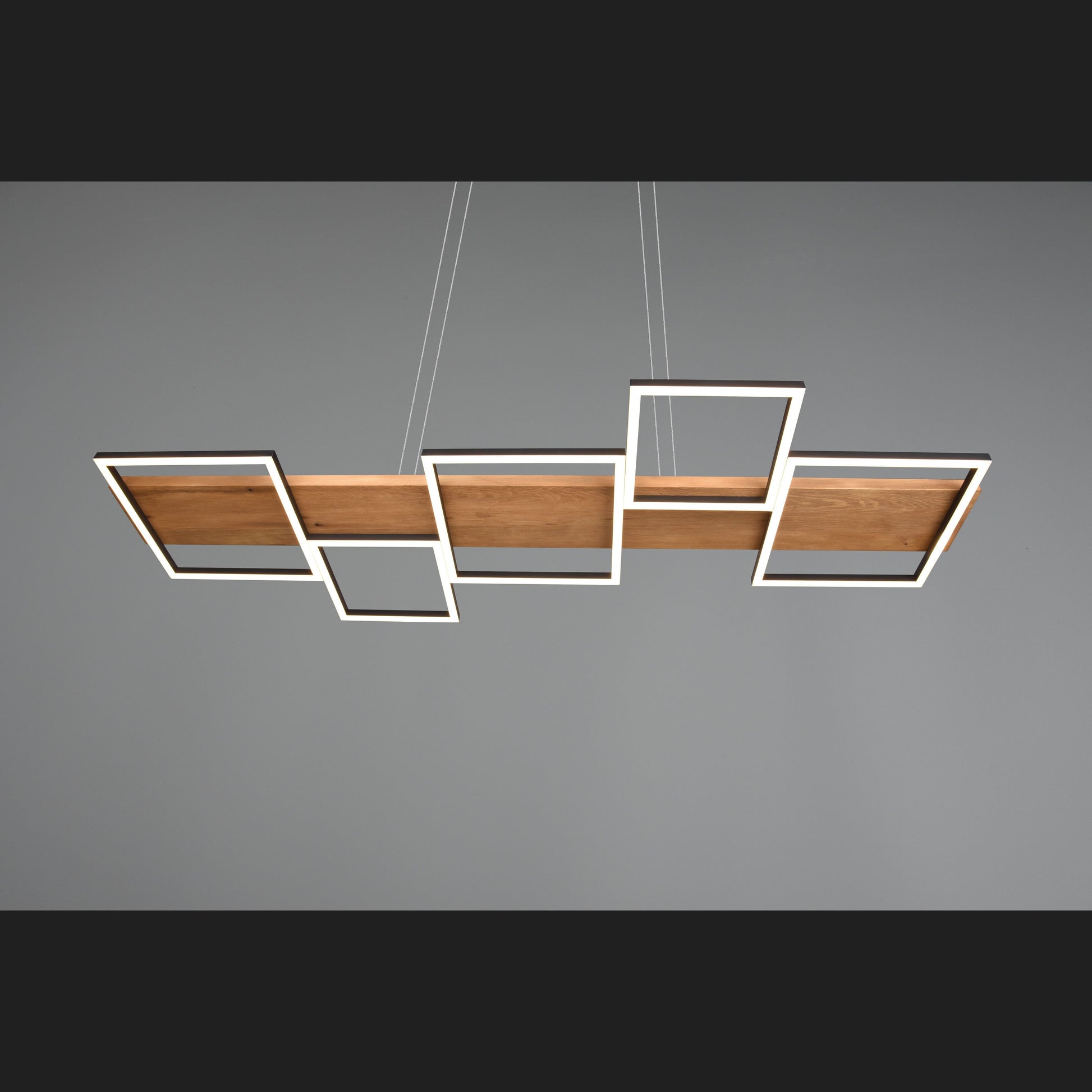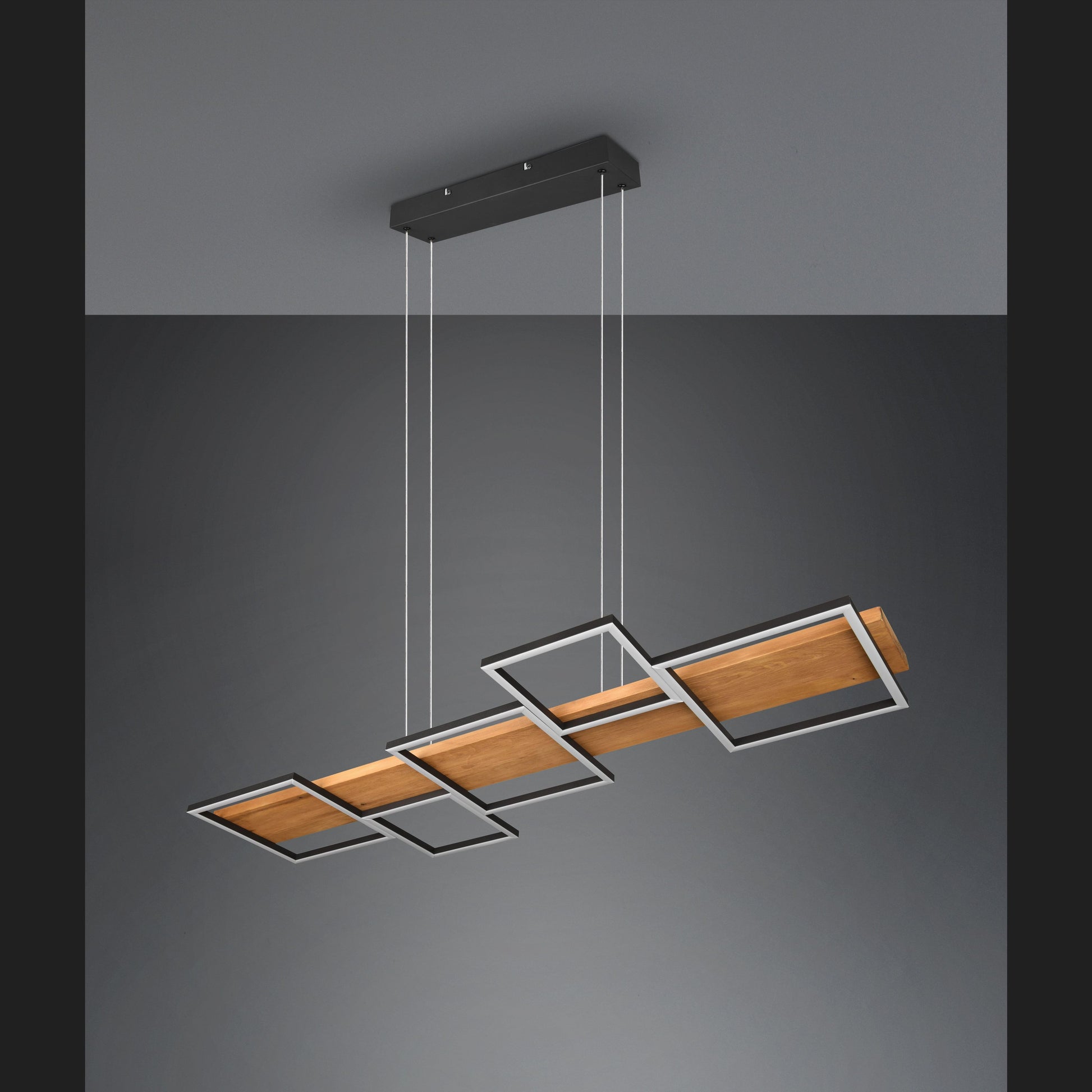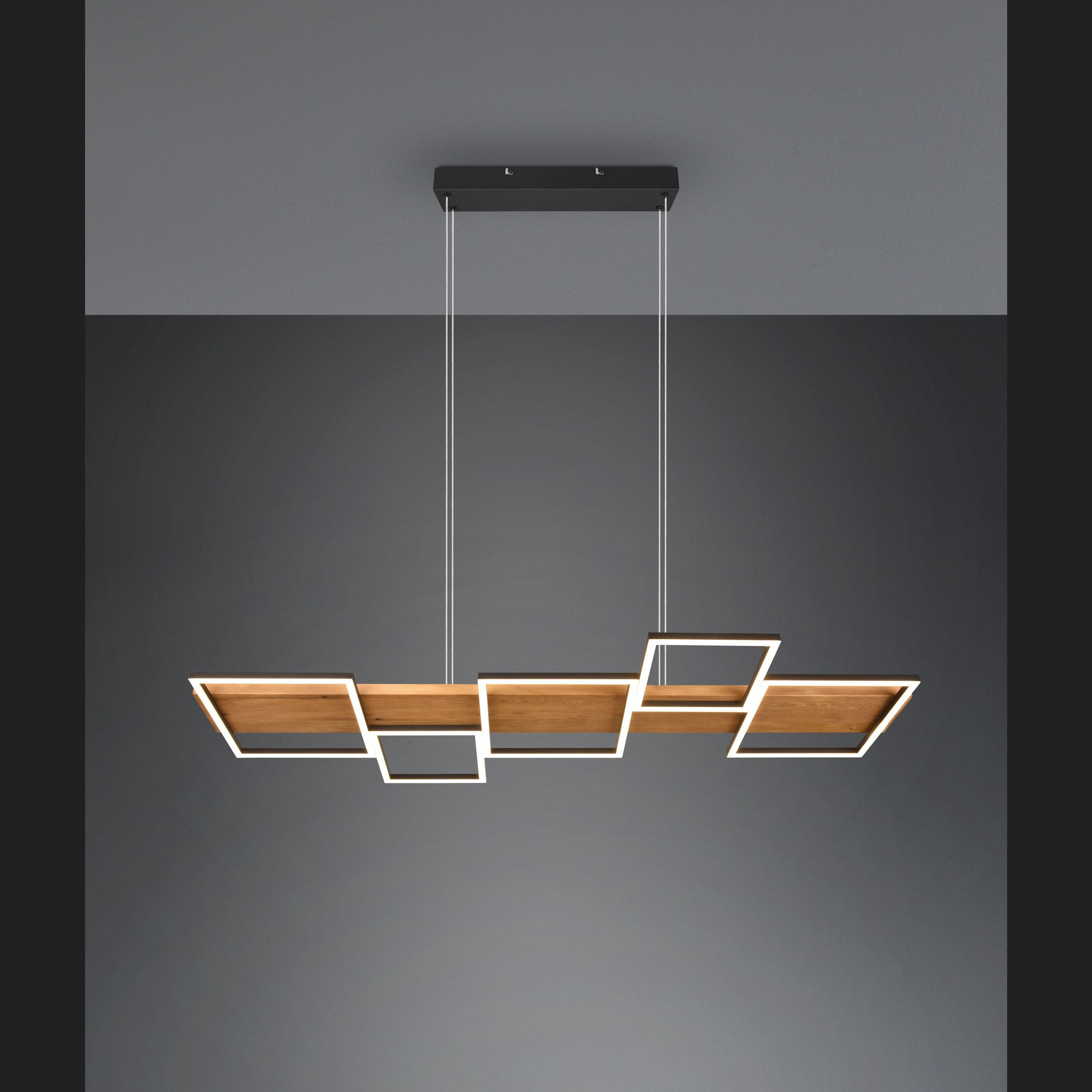 The HARPER pendant lamp promises cosiness and elegance in your home with its modern design. The combination of the materials wood and metal underlines the elegant living style and, with the five square light elements, provides pleasant lighting above the dining table. In addition, the luminaire is equipped with a SWITCH dimmer, allowing the brightness to be graduated from 100%, to 50% and to 25% via a conventional light switch. The natural wood and the metal in black matt make the lamp a real jewel in your living room, which is guaranteed to be an eye-catcher. In addition, the luminaire features modern LED technology, which is characterised by high light quality and energy efficiency. Compared to conventional halogen lamps, up to 80% of energy costs can be saved. In addition, LED light sources have a long service life, produce less heat and protect the environment.
